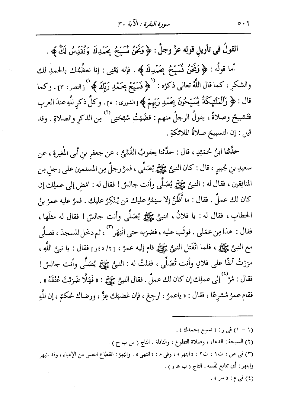 §الْقَوْلُ فِي تَأْوِيلِ قَوْلِهِ تَعَالَى: {وَنَحْنُ نُسَبِّحُ بِحَمْدِكَ وَنُقَدِّسُ لَكَ} [البقرة: 30] قَالَ أَبُو جَعْفَرٍ: أَمَّا قَوْلُهُ: {وَنَحْنُ نُسَبِّحُ بِحَمْدِكَ} [البقرة: 30] فَإِنَّهُ يَعْنِي: إِنَّا نُعَظِّمُكَ بِالْحَمْدِ لَكَ وَالشُّكْرِ، كَمَا قَالَ جَلَّ ثَنَاؤُهُ: {فَسَبِّحْ بِحَمْدِ رَبِّكَ} [الحجر: 98] وَكَمَا قَالَ: {وَالْمَلَائِكَةُ يُسَبِّحُونَ بِحَمْدِ رَبِّهِمْ} [الشورى: 5] وَكُلُّ ذِكْرٌ لِلَّهِ عِنْدَ الْعَرَبِ فَتَسْبِيحٌ وَصَلَاةٌ، يَقُولُ الرَّجُلُ مِنْهُمْ: قَضَيْتُ سُبْحَتِي مِنَ الذِّكْرِ وَالصَّلَاةِ. وَقَدْ قِيلَ إِنَّ التَّسْبِيحَ صَلَاةُ الْمَلَائِكَةِ