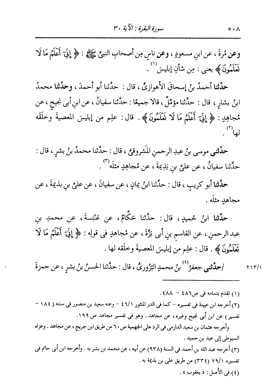 وَحَدَّثَنَا أَحْمَدُ بْنُ إِسْحَاقَ الْأَهْوَازِيُّ، قَالَ: حَدَّثَنَا أَبُو أَحْمَدَ، وَحَدَّثَنَا مُحَمَّدُ بْنُ بَشَّارٍ، قَالَ: حَدَّثَنَا مُؤَمَّلٌ، قَالَا جَمِيعًا: حَدَّثَنَا سُفْيَانُ، عَنِ ابْنِ أَبِي نَجِيحٍ، عَنْ مُجَاهِدٍ: " {§إِنِّي أَعْلَمُ مَا لَا تَعْلَمُونَ} [البقرة: 30] قَالَ: عَلِمَ مِنْ إِبْلِيسَ الْمَعْصِيَةَ وَخَلَقَهُ لَهَا " وَحَدَّثَنِي مُوسَى بْنُ عَبْدِ الرَّحْمَنِ الْمَسْرُوقِيُّ، قَالَ: حَدَّثَنَا مُحَمَّدُ بْنُ بِشْرٍ، قَالَ: حَدَّثَنَا سُفْيَانُ عَنْ عَلِيِّ بْنِ بَذِيمَةَ، عَنْ مُجَاهِدٍ بِمِثْلِهِ حَدَّثَنَا أَبُو كُرَيْبٍ، قَالَ: حَدَّثَنَا ابْنُ يَمَانٍ، عَنْ سُفْيَانَ، عَنْ عَلِيِّ بْنِ بَذِيمَةَ، عَنْ مُجَاهِدٍ مِثْلَهُ