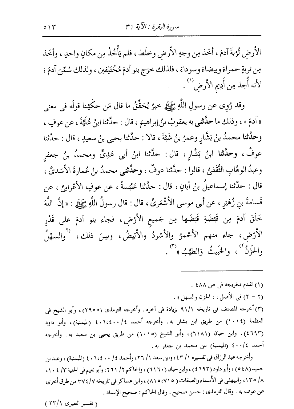 وَذَلِكَ مَا حَدَّثَنِي بِهِ، يَعْقُوبُ بْنُ إِبْرَاهِيمَ، قَالَ: حَدَّثَنَا ابْنُ عُلَيَّةَ، عَنْ عَوْفٍ، وَحَدَّثَنَا مُحَمَّدُ بْنُ بَشَّارٍ، وَعُمَرُ بْنُ شَبَّةَ، قَالَا: حَدَّثَنَا يَحْيَى بْنُ سَعِيدٍ، قَالَ: حَدَّثَنَا عَوْفٌ، وَحَدَّثَنَا ابْنُ بَشَّارٍ، قَالَ: حَدَّثَنَا ابْنُ أَبِي عَدِيٍّ، وَمُحَمَّدُ بْنُ جَعْفَرٍ، وَعَبْدُ الْوَهَّابِ الثَّقَفِيُّ، قَالُوا: حَدَّثَنَا عَوْفٌ، وَحَدَّثَنِي مُحَمَّدُ بْنُ عُمَارَةَ الْأَسَدِيُّ، قَالَ: حَدَّثَنَا إِسْمَاعِيلُ بْنُ أَبَانَ، قَالَ: حَدَّثَنَا عَنْبَسَةُ، عَنْ عَوْفٍ الْأَعْرَابِيِّ، عَنْ قَسَامَةَ بْنِ زُهَيْرٍ، عَنْ أَبِي مُوسَى الْأَشْعَرِيِّ، قَالَ: قَالَ رَسُولُ اللَّهِ صَلَّى اللهُ عَلَيْهِ وَسَلَّمَ: «إِنَّ اللَّهَ §خَلَقَ آدَمَ مِنْ قَبْضَةٍ قَبَضَهَا مِنْ جَمِيعِ الْأَرْضِ، فَجَاءَ بَنُو آدَمَ عَلَى قَدْرِ الْأَرْضِ جَاءَ مِنْهُمُ الْأَحْمَرُ وَالْأَسْوَدُ وَالْأَبْيَضُ وَبَيْنَ ذَلِكَ وَالسَّهْلُ وَالْحَزَنُ وَالْخَبِيثُ وَالطَّيِّبُ» -[514]- فَعَلَى التَّأْوِيلِ الَّذِي تَأَوَّلَ آدَمَ مَنْ تَأَوَّلَهُ بِمَعْنَى أَنَّهُ خُلِقَ مِنْ أَدِيمِ الْأَرْضِ، يَجِبُ أَنْ يَكُونَ أَصْلُ آدَمَ فِعْلًا سُمِّيَ بِهِ أَبُو الْبَشَرِ، كَمَا سُمِّيَ أَحْمَدُ بِالْفِعْلِ مِنَ الْإِحْمَادِ، وَأَسْعَدُ مِنَ الْإِسْعَادِ، فَلِذَلِكَ لَمْ يُجْرَ، وَيَكُونُ تَأْوِيلُهُ حِينَئِذٍ: آدَمَ الْمَلَكُ الْأَرْضَ، يَعْنِي بِهِ بَلَغَ آدَمَتَهَا، وَآدَمَتُهَا وَجْهُهَا الظَّاهِرُ لَرَأْيِ الْعَيْنِ، كَمَا أَنَّ جِلْدَةَ كُلِّ ذِي جِلْدَةٍ لَهُ آدَمَةٌ، وَمِنْ ذَلِكَ سُمِّيَ الْإِدَامُ إِدَامًا، لِأَنَّهُ صَارَ كَالْجِلْدَةِ الْعُلْيَا مِمَّا هِيَ مِنْهُ، ثُمَّ نُقِلَ مِنَ الْفِعْلِ فَجُعِلَ اسْمًا لِلشَّخْصِ بِعَيْنِهِ