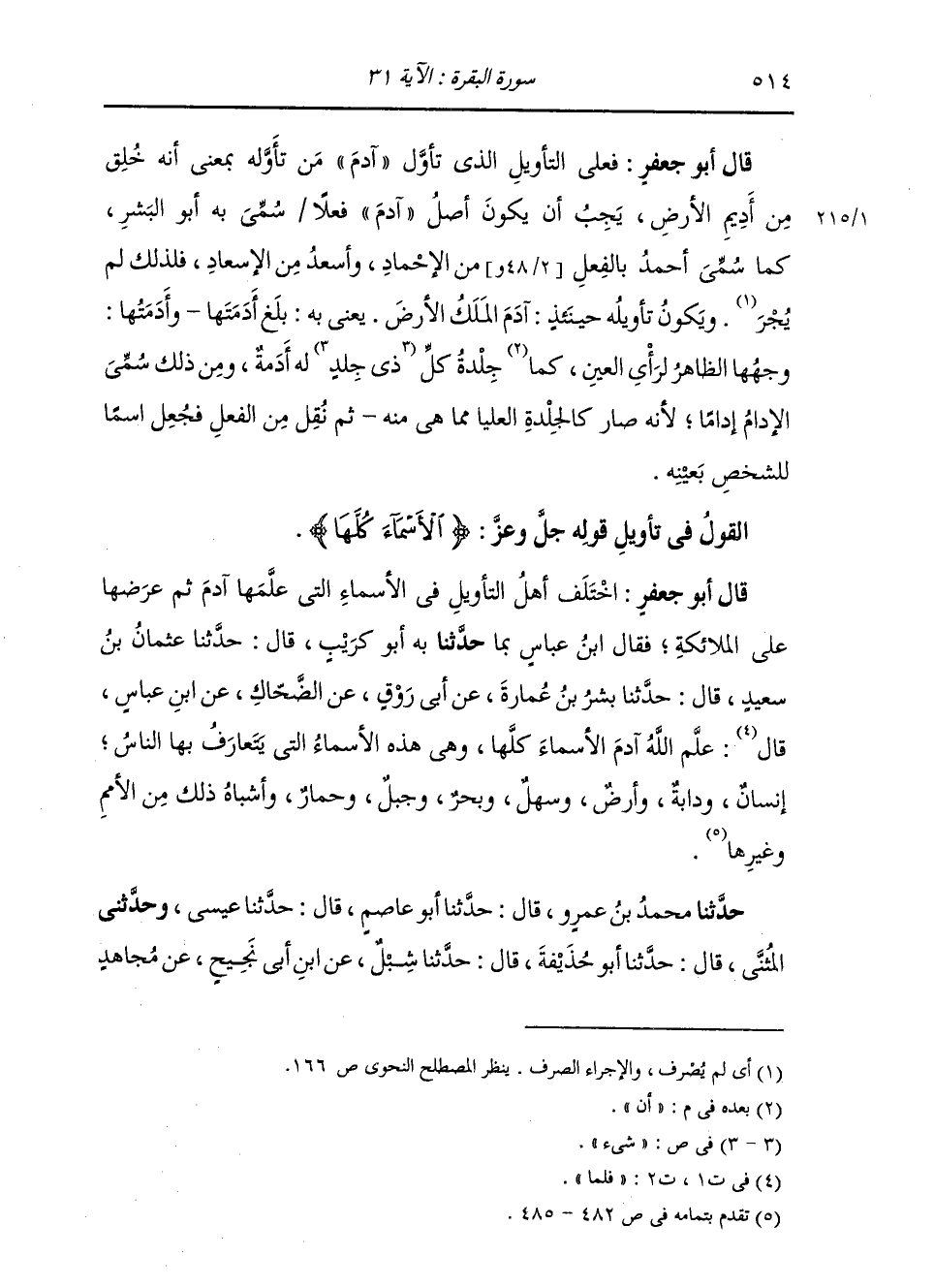 §الْقَوْلُ فِي تَأْوِيلِ قَوْلِهِ تَعَالَى: {الْأَسْمَاءَ كُلَّهَا} [البقرة: 31] قَالَ أَبُو جَعْفَرٍ: اخْتَلَفَ أَهْلُ التَّأْوِيلِ فِي الْأَسْمَاءِ الَّتِي عَلَّمَهَا آدَمَ ثُمَّ عَرَضَهَا عَلَى الْمَلَائِكَةِ