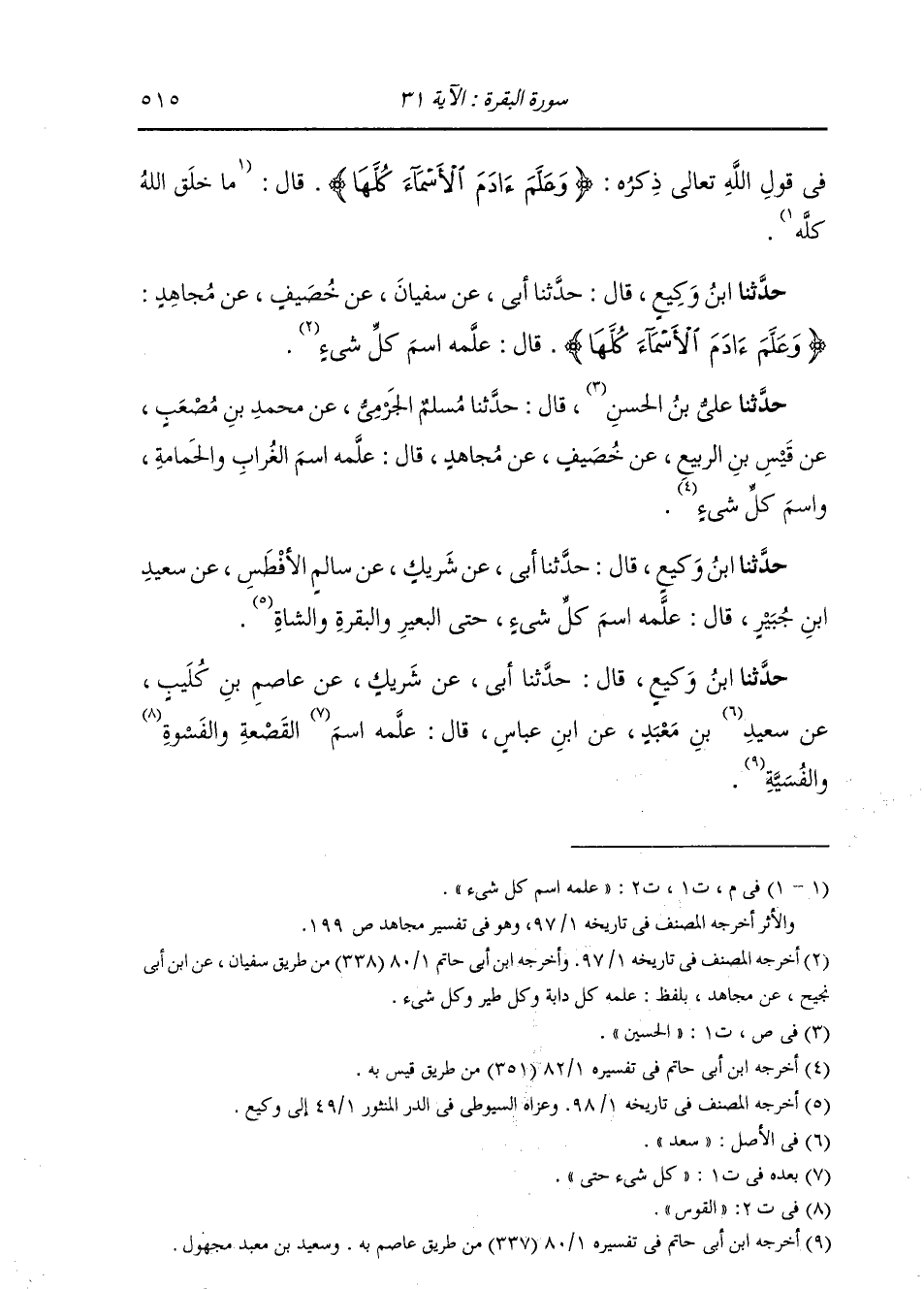 وَحَدَّثَنَا ابْنُ وَكِيعٍ، قَالَ: حَدَّثَنَا أَبِي، عَنْ سُفْيَانَ، عَنْ خُصَيْفٍ، عَنْ مُجَاهِدٍ: " {§وَعَلَّمَ آدَمَ الْأَسْمَاءَ كُلَّهَا} [البقرة: 31] قَالَ: عَلَّمَهُ اسْمَ كُلِّ شَيْءٍ "