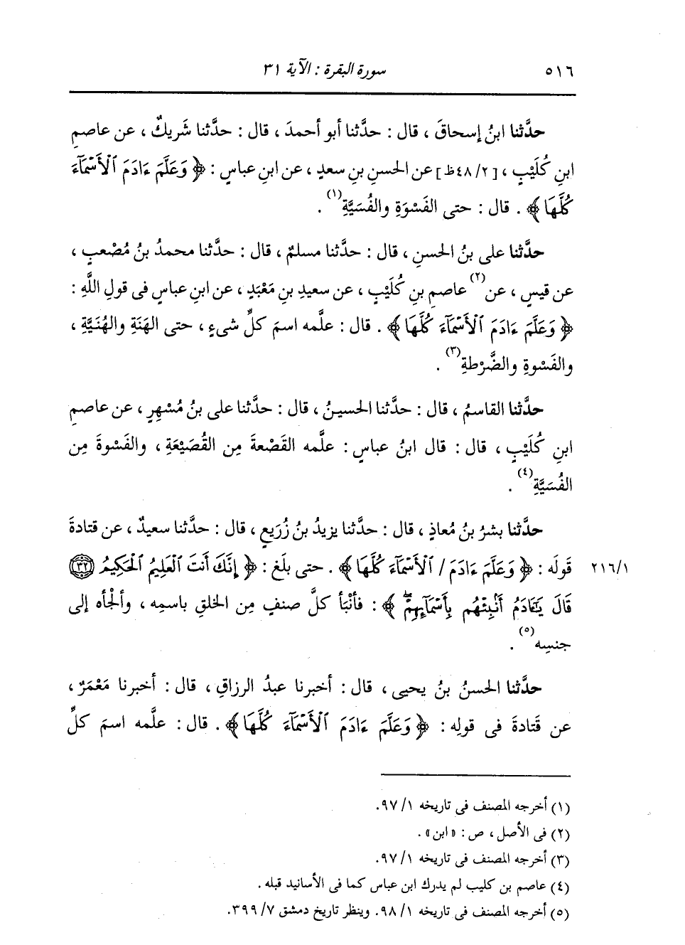 وَحَدَّثَنَا أَحْمَدُ بْنُ إِسْحَاقَ، قَالَ: حَدَّثَنَا أَبُو أَحْمَدَ، قَالَ: حَدَّثَنَا شَرِيكٌ، عَنْ عَاصِمِ بْنِ كُلَيْبٍ، عَنِ الْحَسَنِ بْنِ سَعْدٍ، عَنِ ابْنِ عَبَّاسٍ: " {§وَعَلَّمَ آدَمَ الْأَسْمَاءَ كُلَّهَا} [البقرة: 31] قَالَ: حَتَّى الْفَسْوَةَ وَالْفُسَيَّةَ "