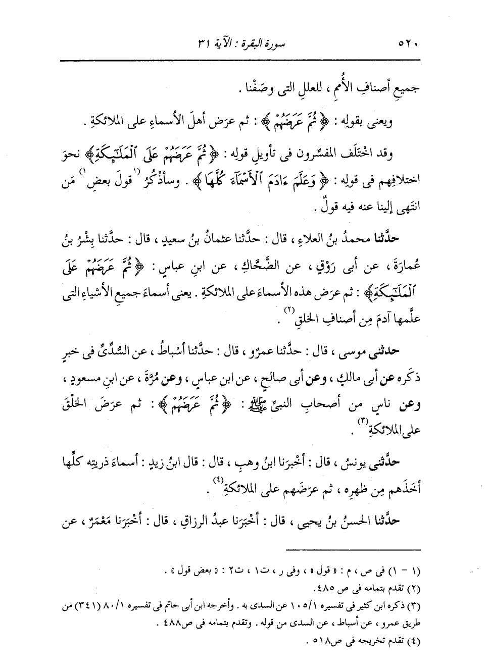 حَدَّثَنَا مُحَمَّدُ بْنُ الْعَلَاءِ، قَالَ: حَدَّثَنَا عُثْمَانُ بْنُ سَعِيدٍ، قَالَ: حَدَّثَنَا بِشْرُ بْنُ عُمَارَةَ، عَنْ أَبِي رَوْقٍ، عَنِ الضَّحَّاكِ، عَنِ ابْنِ عَبَّاسٍ: " {§ثُمَّ عَرَضَهُمْ عَلَى الْمَلَائِكَةِ} [البقرة: 31] ثُمَّ عَرَضَ هَذِهِ الْأَسْمَاءَ؛ يَعْنِي أَسْمَاءَ جَمِيعِ الْأَشْيَاءِ الَّتِي عَلَّمَهَا آدَمَ مِنْ أَصْنَافِ جَمِيعِ الْخَلْقِ "