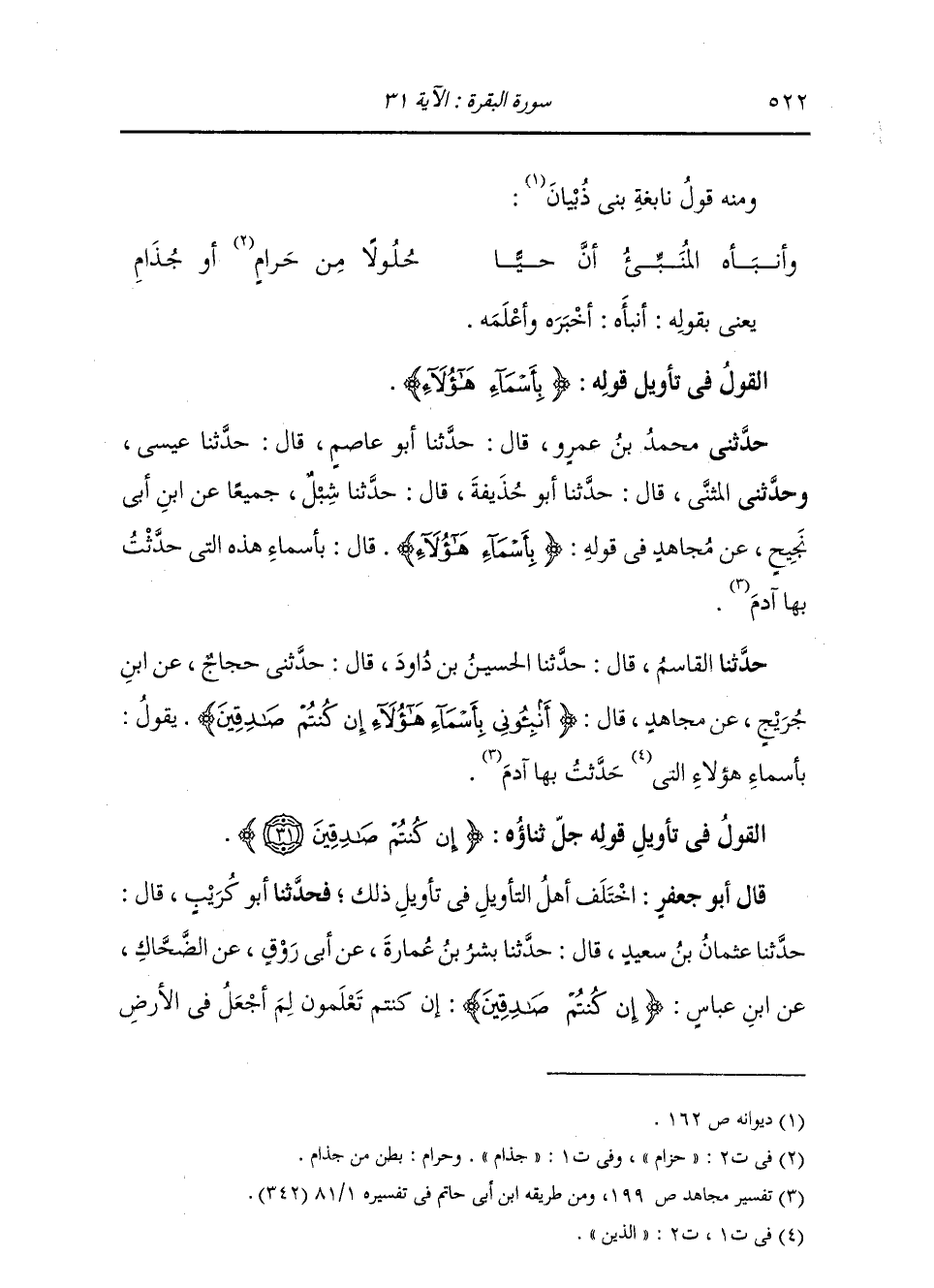 حَدَّثَنِي مُحَمَّدُ بْنُ عَمْرٍو، قَالَ: حَدَّثَنَا أَبُو عَاصِمٍ، قَالَ: حَدَّثَنَا عِيسَى، وَحَدَّثَنَا الْمُثَنَّى، قَالَ: حَدَّثَنَا أَبُو حُذَيْفَةَ، قَالَ: حَدَّثَنَا شِبْلٌ، عَنِ ابْنِ أَبِي نَجِيحٍ، عَنْ مُجَاهِدٍ: " فِي قَوْلِ اللَّهِ: {§بِأَسْمَاءِ هَؤُلَاءِ} [البقرة: 31] قَالَ: بِأَسْمَاءِ هَذِهِ الَّتِي حَدَّثْتُ بِهَا آدَمَ "