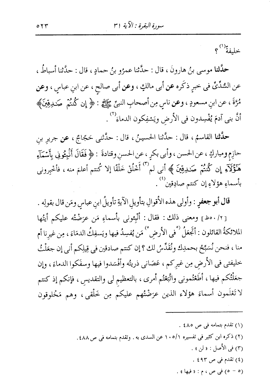 وَحَدَّثَنَا مُوسَى بْنُ هَارُونَ، قَالَ: حَدَّثَنَا عَمْرُو بْنُ حَمَّادٍ، قَالَ: حَدَّثَنَا أَسْبَاطٌ، عَنِ السُّدِّيِّ، فِي خَبَرٍ ذَكَرَهُ عَنْ أَبِي مَالِكٍ، وَعَنْ أَبِي صَالِحٍ، عَنِ ابْنِ عَبَّاسٍ، وَعَنْ مُرَّةَ، عَنِ ابْنِ مَسْعُودٍ، وَعَنْ نَاسٍ، مِنْ أَصْحَابِ النَّبِيِّ صَلَّى اللهُ عَلَيْهِ وَسَلَّمَ: " {§إِنْ كُنْتُمْ صَادِقِينَ} [البقرة: 23] أَنَّ بَنِي آدَمَ يُفْسِدُونَ فِي الْأَرْضِ وَيَسْفِكُونَ الدِّمَاءَ "