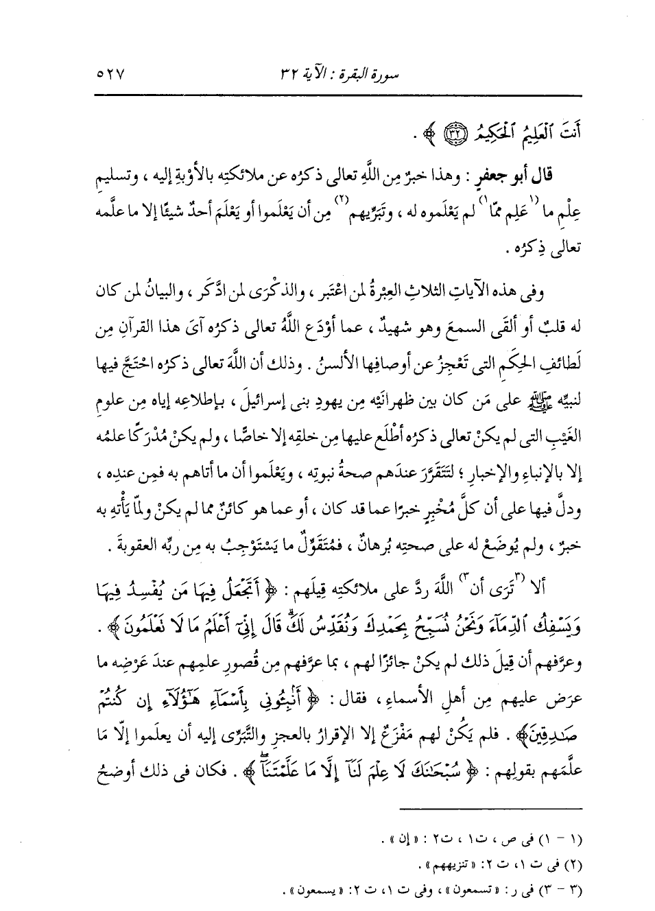 أَنْتَ الْعَلِيمُ الْحَكِيمُ} [البقرة: 32] قَالَ أَبُو جَعْفَرٍ: وَهَذَا خَبَرٌ مِنَ اللَّهِ جَلَّ ذِكْرُهُ عَنْ مَلَائِكَتِهِ بِالْأَوْبَةِ إِلَيْهِ، وَتَسْلِيمِ عِلْمِ مَا لَمْ يَعْلَمُوهُ لَهُ، وَتَبَرِّيهِمْ مِنْ أَنْ يَعْلَمُوا أَوْ يَعْلَمَ أَحَدٌ شَيْئًا إِلَّا مَا عَلِمَهُ تَعَالَى ذِكْرُهُ. وَفِي هَذِهِ الْآيَاتِ الثَّلَاثِ الْعِبْرَةُ لِمَنِ اعْتَبَرِ، وَالذِّكْرَى لِمَنِ ادَّكَرَ، وَالْبَيَانُ لِمَنْ كَانَ لَهُ قَلْبٌ أَوْ أَلْقَى السَّمْعَ وَهُوَ شَهِيدٌ، عَمَّا أَوْدَعَ اللَّهُ جَلَّ ثَنَاؤُهُ آيَ هَذَا الْقُرْآنِ مِنْ لَطَائِفِ الْحِكَمِ الَّتِي تَعْجِزُ عَنْ أَوْصَافِهَا الْأَلْسُنُ. وَذَلِكَ أَنَّ اللَّهَ جَلَّ ثَنَاؤُهُ احْتَجَّ فِيهَا لِنَبِيِّهِ صَلَّى اللهُ عَلَيْهِ وَسَلَّمَ عَلَى مَنْ كَانَ بَيْنَ ظَهْرَانَيْهِ مِنْ يَهُودِ بَنِي إِسْرَائِيلَ بِإِطْلَاعِهِ إِيَّاهُ مِنْ عُلُومِ الْغَيْبِ الَّتِي لَمْ يَكُنْ جَلَّ ثَنَاؤُهُ أَطْلَعَ عَلَيْهَا مِنْ خَلْقِهِ إِلَّا خَاصًّا، وَلَمْ يَكُنْ مُدْرِكًا عِلْمَهُ إِلَّا بِالْإِنْبَاءِ وَالْإِخْبَارِ، لَتَتَقَرَّرَ عِنْدَهُمْ صِحَّةُ نُبُوَّتِهِ، وَيَعْلَمُوا أَنَّ مَا أَتَاهُمْ بِهِ فَمِنْ عِنْدَهُ، وَدَلَّ فِيهَا عَلَى أَنَّ كُلَّ مُخْبِرٌ خَبَرًا عَمَّا قَدْ كَانَ أَوْ عَمَّا هُوَ كَائِنٌ مِمَّا لَمْ يَكُنْ وَلَمْ يَأْتِهِ بِهِ خَبَرٌ وَلَمْ يُوضَعْ لَهُ عَلَى صِحَّتِهِ بُرْهَانٌ فَمُتَقَوِّلٌ مَا يَسْتَوْجِبُ بِهِ مِنْ رَبِّهِ الْعُقُوبَةَ. أَلَا تَرَى أَنَّ اللَّهَ جَلَّ ذِكْرُهُ رَدَّ عَلَى مَلَائِكَتِهِ قِيلَهُمْ: {أَتَجْعَلُ فِيهَا مَنْ يُفْسِدُ فِيهَا وَيَسْفِكُ الدِّمَاءَ وَنَحْنُ نُسَبِّحُ بِحَمْدِكَ وَنُقَدِّسُ لَكَ قَالَ إِنِّي أَعْلَمُ مَا لَا تَعْلَمُونَ} [البقرة: 30] وَعَرَّفَهُمْ أَنَّ قِيلَ ذَلِكَ لَمْ يَكُنْ جَائِزًا لَهُمْ بِمَا عَرَّفَهُمْ مِنْ قُصُورِ عِلْمِهِمْ عِنْدَ عَرْضِهِ مَا عَرَضَ عَلَيْهِمْ مِنْ أَهْلِ الْأَسْمَاءِ، فَقَالَ: {أَنْبِئُونِي بِأَسْمَاءِ هَؤُلَاءِ إِنْ كُنْتُمْ صَادِقِينَ} [البقرة: 31] فَلَمْ يَكُنْ لَهُمْ مَفْزَعٌ إِلَّا الْإِقْرَارَ بِالْعَجْزِ وَالتَّبَرِّي إِلَيْهِ أَنْ يَعْلَمُوا إِلَّا مَا عَلَّمَهُمْ بِقَوْلِهِمْ: {سُبْحَانَكَ لَا عِلْمَ لَنَا إِلَّا مَا عَلَّمْتَنَا} [البقرة: 32] فَكَانَ فِي ذَلِكَ أَوْضَحُ