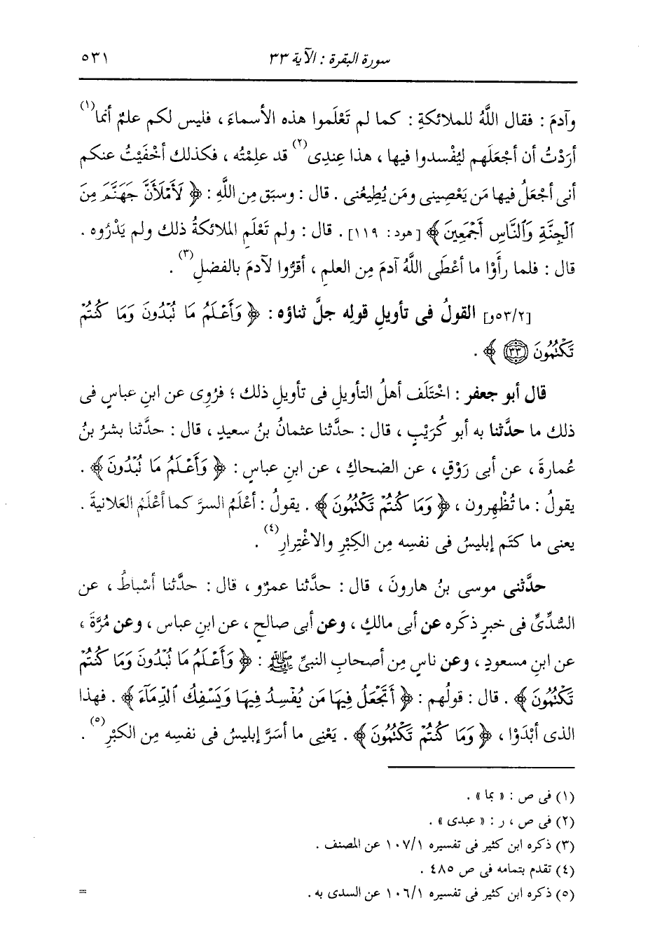 §الْقَوْلُ فِي تَأْوِيلِ قَوْلِهِ تَعَالَى: {وَأَعْلَمُ مَا تُبْدُونَ وَمَا كُنْتُمْ تَكْتُمُونَ} [البقرة: 33] قَالَ أَبُو جَعْفَرٍ: اخْتَلَفَ أَهْلُ التَّأْوِيلِ فِي تَأْوِيلِ ذَلِكَ