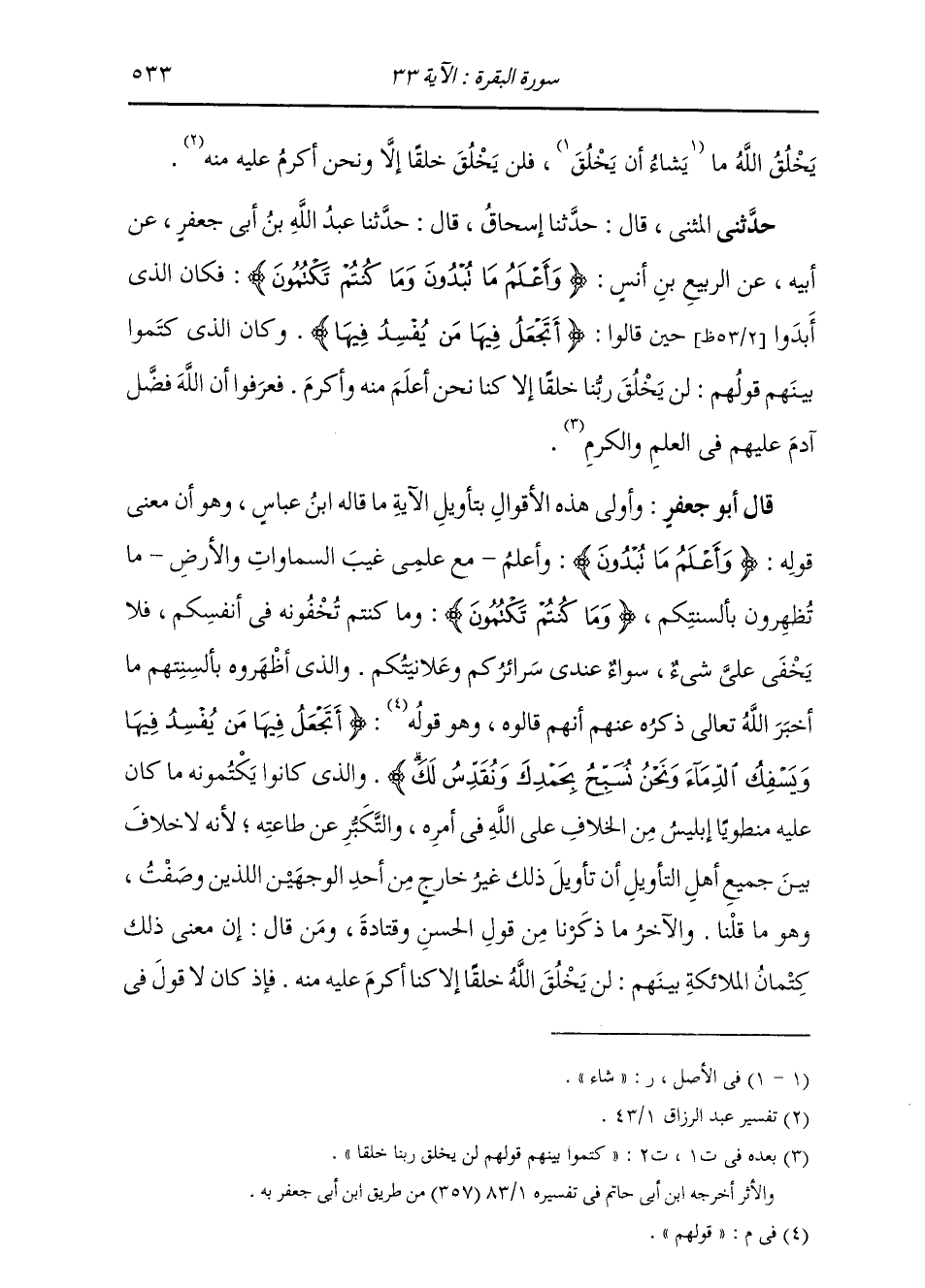 وَحَدَّثَنِي الْمُثَنَّى، قَالَ: حَدَّثَنَا إِسْحَاقُ، قَالَ: حَدَّثَنَا عَبْدُ اللَّهِ بْنُ أَبِي جَعْفَرٍ، عَنْ أَبِيهِ، عَنِ الرَّبِيعِ بْنِ أَنَسٍ: " {§وَأَعْلَمُ مَا تُبْدُونَ وَمَا كُنْتُمْ تَكْتُمُونَ} [البقرة: 33] فَكَانَ الَّذِي أَبَدَوْا حِينَ قَالُوا: {أَتَجْعَلُ فِيهَا مَنْ يُفْسِدُ فِيهَا} [البقرة: 30] وَكَانَ الَّذِي كَتَمُوا بَيْنَهُمْ قَوْلَهُمْ: لَنْ يَخْلُقَ رَبُّنَا خَلْقًا إِلَّا كُنَّا نَحْنُ أَعْلَمَ مِنْهُ وَأَكْرَمَ. فَعَرَفُوا أَنَّ اللَّهَ فَضَّلَ عَلَيْهِمْ آدَمَ فِي الْعِلْمِ وَالْكَرَمِ " قَالَ أَبُو جَعْفَرٍ: وَأَوْلَى هَذِهِ الْأَقْوَالِ بِتَأْوِيلِ الْآيَةِ مَا قَالَهُ ابْنُ عَبَّاسٍ، وَهُوَ أَنَّ مَعْنَى قَوْلِهِ: {وَأَعْلَمُ مَا تُبْدُونَ} [البقرة: 33] وَأَعْلَمُ مَعَ عِلْمِي غَيْبَ السَّمَوَاتِ وَالْأَرْضِ مَا تُظْهِرُونَ بِأَلْسِنَتِكُمْ {وَمَا كُنْتُمْ تَكْتُمُونَ} [البقرة: 33] وَمَا كُنْتُمْ تُخْفُونَهُ فِي أَنْفُسِكُمْ، فَلَا يَخْفَى عَلَيَّ شَيْءٌ سَوَاءٌ عِنْدِي سَرَائِرُكُمْ وَعَلَانِيَتِكُمْ. وَالَّذِي أَظْهَرُوهُ بِأَلْسِنَتِهِمْ مَا أَخْبَرَ اللَّهُ جَلَّ ثَنَاؤُهُ عَنْهُمْ أَنَّهُمْ قَالُوهُ، وَهُوَ قَوْلُهُمْ: {أَتَجْعَلُ فِيهَا مَنْ يُفْسِدُ فِيهَا وَيَسْفِكُ الدِّمَاءَ وَنَحْنُ نُسَبِّحُ بِحَمْدِكَ وَنُقَدِّسُ لَكَ} [البقرة: 30] وَالَّذِي كَانُوا يَكْتُمُونَهُ مَا كَانَ مُنْطَوِيًا عَلَيْهِ إِبْلِيسُ مِنَ الْخِلَافِ عَلَى اللَّهِ فِي أَمْرِهِ وَالتَّكَبُّرِ عَنْ طَاعَتِهِ؛ لِأَنَّهُ لَا خِلَافَ بَيْنَ جَمِيعِ أَهْلِ التَّأْوِيلِ أَنْ تَأْوِيلَ ذَلِكَ غَيْرُ خَارِجٍ مِنْ أَحَدِ الْوَجْهَيْنِ اللَّذَيْنِ وَصَفْتُ، وَهُوَ مَا قُلْنَا. وَالْآخَرُ مَا ذَكَرْنَا مِنْ قَوْلِ الْحَسَنِ وَقَتَادَةِ. وَمَنْ قَالَ: إِنَّ مَعْنَى ذَلِكَ كِتْمَانُ الْمَلَائِكَةِ بَيْنَهُمْ لَنْ يَخْلُقَ اللَّهُ خَلْقًا إِلَّا كُنَّا أَكْرَمَ عَلَيْهِ مِنْهُ؛ فَإِذْ كَانَ لَا قَوْلَ فِي -[534]- تَأْوِيلِ ذَلِكَ إِلَّا أَحَدَ الْقَوْلَيْنِ اللَّذَيْنِ وَصَفْتَ ثُمَّ كَانَ أَحَدُهُمَا غَيْرُ مَوْجُودَةٍ عَلَى صِحَّتِهِ الدَّلَالَةُ مِنَ الْوَجْهِ الَّذِي يَجِبُ التَّسْلِيمُ لَهُ صَحَّ الْوَجْهُ الْآخَرُ. فَالَّذِي حُكِيَ عَنِ الْحَسَنِ وَقَتَادَةَ وَمَنْ قَالَ بِقَوْلِهِمَا فِي تَأْوِيلِ ذَلِكَ غَيْرُ مَوْجُودَةٍ الدَّلَالَةُ عَلَى صِحَّتِهِ مِنَ الْكِتَابِ وَلَا مِنْ خَبَرٍ يَجِبُ بِهِ حُجَّةٌ. وَالَّذِي قَالَهُ ابْنُ عَبَّاسٍ يَدُلُّ عَلَى صِحَّتِهِ خَبَرُ اللَّهِ جَلَّ ثَنَاؤُهُ عَنْ إِبْلِيسِ وَعِصْيَانِهِ إِيَّاهُ إِذْ دَعَاهُ إِلَى السُّجُودِ لِآدَمَ، فَأَبَى وَاسْتَكْبَرَ، وَإِظْهَارِهِ لِسَائِرِ الْمَلَائِكَةِ مِنْ مَعْصِيَتِهِ وَكِبْرِهِ مَا كَانَ لَهُ كَاتِمًا قَبْلَ ذَلِكَ. فَإِنْ ظَنَّ ظَانٌّ أَنَّ الْخَبَرَ عَنْ كِتْمَانِ الْمَلَائِكَةِ مَا كَانُوا يَكْتُمُونَهُ لَمَّا كَانَ خَارِجًا مَخْرَجَ الْخَبَرِ عَنِ الْجَمِيعِ كَانَ غَيْرَ جَائِزٍ أَنْ يَكُونَ مَا رُوِيَ فِي تَأْوِيلِ ذَلِكَ عَنِ ابْنِ عَبَّاسٍ وَمَنْ قَالَ بِقَوْلِهِ مِنْ أَنَّ ذَلِكَ خَبَرٌ عَنْ كِتْمَانِ إِبْلِيسَ الْكِبْرَ وَالْمَعْصِيَةَ صَحِيحًا، فَقَدْ ظَنَّ غَيْرَ الصَّوَابِ؛ وَذَلِكَ أَنَّ مِنْ شَأْنِ الْعَرَبِ إِذَا أَخْبَرَتْ خَبَرًا عَنْ بَعْضِ جَمَاعَةٍ بِغَيْرٍ تَسْمِيَةِ شَخْصٍ بِعَيْنِهِ أَنْ تُخْرِجَ الْخَبَرَ عَنْهُ مَخْرَجَ الْخَبَرِ عَنْ جَمِيعِهِمْ، وَذَلِكَ كَقَوْلِهِمْ: قُتِلَ الْجَيْشُ وَهُزِمُوا، وَإِنَّمَا قُتِلَ الْوَاحِدُ أَوِ الْبَعْضُ مِنْهُمْ، وَهُزِمَ الْوَاحِدُ أَوِ الْبَعْضُ، فَتُخْرِجُ الْخَبَرَ عَنِ الْمَهْزُومِ مِنْهُ وَالْمَقْتُولِ مَخْرَ