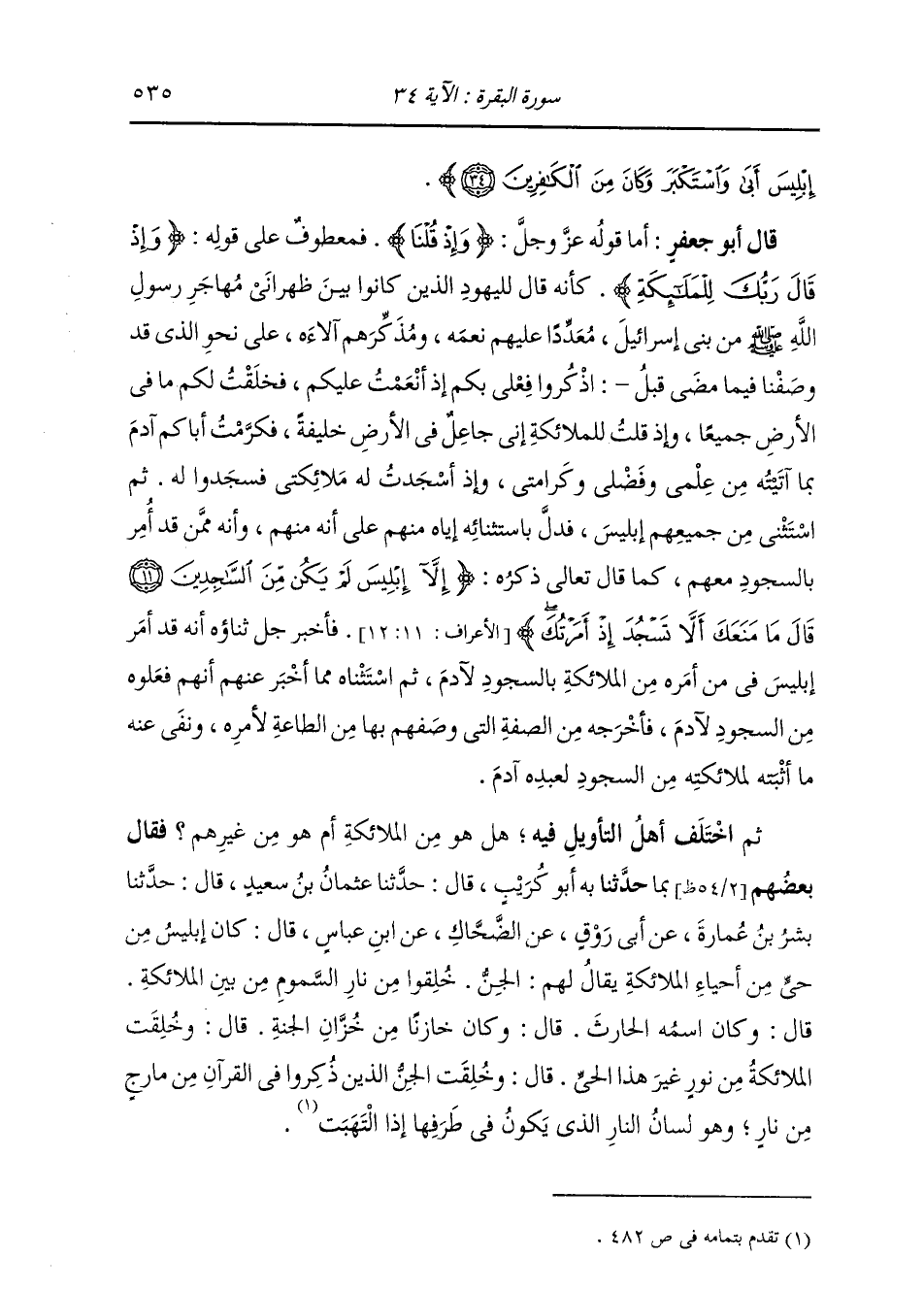 إِبْلِيسَ أَبَى وَاسْتَكْبَرَ وَكَانَ مِنَ الْكَافِرِينَ} [البقرة: 34] قَالَ أَبُو جَعْفَرٍ: أَمَّا قَوْلُهُ: {وَإِذْ قُلْنَا} [البقرة: 34] فَمَعْطُوفٌ عَلَى قَوْلِهِ: {وَإِذْ قَالَ رَبُّكَ لِلْمَلَائِكَةِ} [البقرة: 30] كَأَنَّهُ قَالَ جَلَّ ذِكْرُهُ لِلْيَهُودِ الَّذِينَ كَانُوا بَيْنَ ظَهْرَانَيْ مُهَاجَرِ رَسُولِ اللَّهِ صَلَّى اللهُ عَلَيْهِ وَسَلَّمَ مِنْ بَنِي إِسْرَائِيلَ مُعَدِّدًا عَلَيْهِمْ نِعَمَهُ، وَمُذَكِّرَهُمْ آلَاءَهُ عَلَى نَحْوِ الَّذِي وَصَفْنَا فِيمَا مَضَى قَبْلُ: اذْكُرُوا فِعْلِي بِكُمْ إِذْ أَنْعَمْتُ عَلَيْكُمْ، فَخَلَقْتُ لَكُمْ مَا فِي الْأَرْضِ جَمِيعًا، وَإِذْ قُلْتُ لِلْمَلَائِكَةِ إِنِّي جَاعِلٌ فِي الْأَرْضِ خَلِيفَةً، فَكَرَّمْتُ أَبَاكُمْ آدَمَ بِمَا أَتَيْتُهُ مِنْ عِلْمِي وَفَضْلِي وَكَرَامَتِي، وَإِذْ أَسْجَدْتُ لَهُ مَلَائِكَتِي فَسَجَدُوا لَهُ. ثُمَّ اسْتَثْنَى مِنْ جَمِيعِهِمْ إِبْلِيسَ، فَدَلَّ بِاسْتِثْنَائِهِ إِيَّاهُ مِنْهُمْ عَلَى أَنَّهُ مِنْهُمْ، وَأَنَّهُ مِمَّنْ قَدْ أُمِرَ بِالسُّجُودِ مَعَهُمْ، كَمَا قَالَ جَلَّ ثَنَاؤُهُ: {إِلَّا إِبْلِيسَ لَمْ يَكُنْ مِنَ السَّاجِدِينَ قَالَ مَا مَنَعَكَ أَلَّا تَسْجُدَ إِذْ أَمَرْتُكَ} [الأعراف: 12] فَأَخْبَرَ جَلَّ ثَنَاؤُهُ أَنَّهُ قَدْ أَمَرَ إِبْلِيسَ فِيمَنْ أَمَرَهُ مِنَ الْمَلَائِكَةِ بِالسُّجُودِ لِآدَمَ. ثُمَّ اسْتَثْنَاهُ جَلَّ ثَنَاؤُهُ مِمَّا أَخْبَرَ عَنْهُمْ أَنَّهُمْ فَعَلُوهُ مِنَ السُّجُودِ لِآدَمَ، فَأَخْرَجَهُ مِنَ الصِّفَةِ الَّتِي وَصَفَهُمْ بِهَا مِنَ الطَّاعَةِ لِأَمْرِهِ وَنَفَى عَنْهُ مَا أَثْبَتَهُ لِمَلَائِكَتِهِ مِنَ السُّجُودِ لِعَبْدِهِ آدَمَ. ثُمَّ اخْتَلَفَ أَهْلُ التَّأْوِيلِ فِيهِ هَلْ هُوَ مِنَ الْمَلَائِكَةِ أَمْ هُوَ مِنْ غَيْرِهِمْ؟