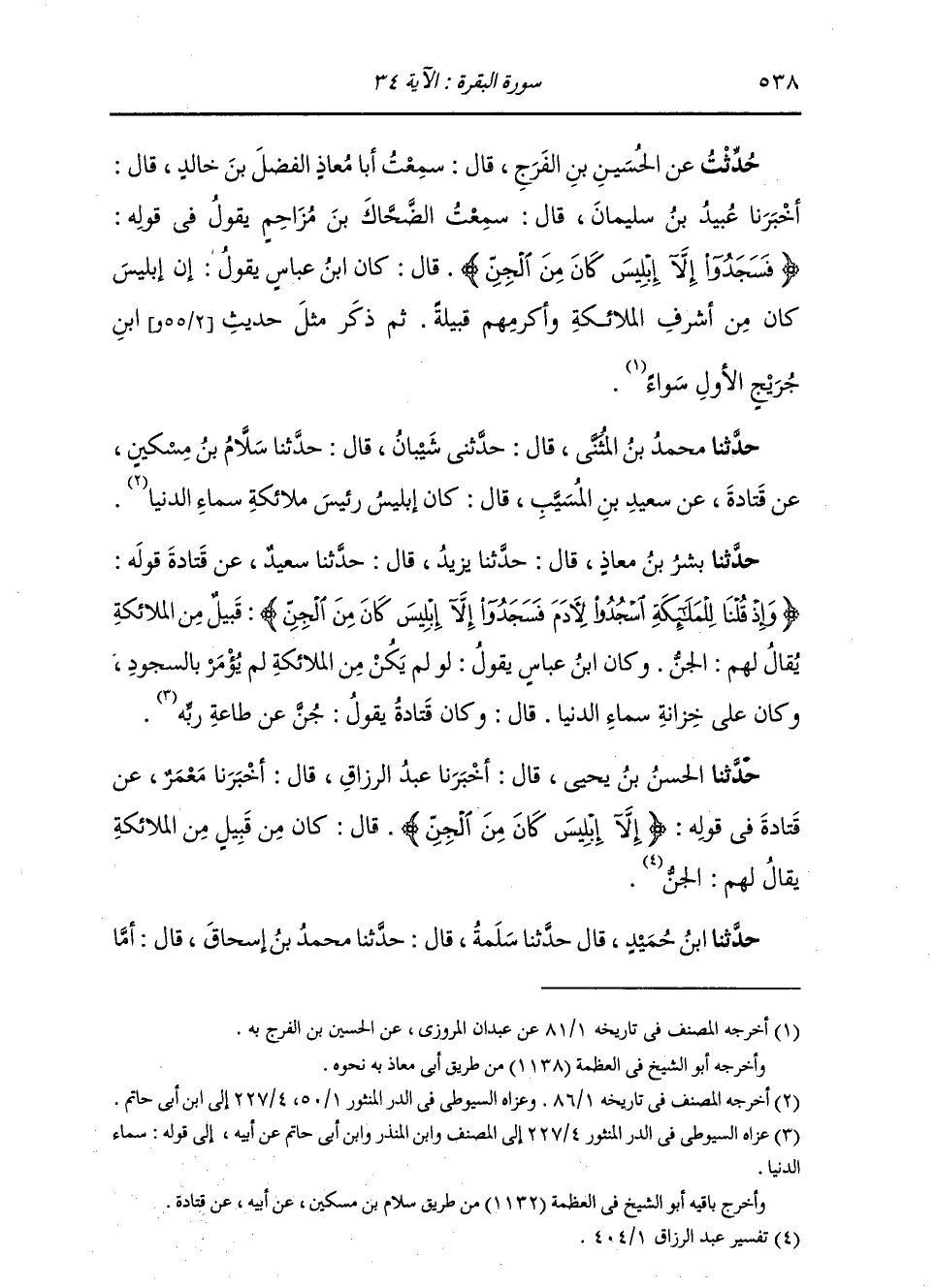 وَحَدَّثَنَا بِشْرُ بْنُ مُعَاذٍ، قَالَ: حَدَّثَنَا يَزِيدُ، قَالَ: حَدَّثَنَا سَعِيدٌ، عَنْ قَتَادَةَ: " قَوْلُهُ: {وَإِذْ قُلْنَا لِلْمَلَائِكَةِ اسْجُدُوا لِآدَمَ فَسَجَدُوا إِلَّا إِبْلِيسَ كَانَ مِنَ الْجِنِّ} [الكهف: 50] §كَانَ مِنْ قَبِيلٍ مِنَ الْمَلَائِكَةِ يُقَالُ لَهُمُ الْجِنُّ " وَكَانَ ابْنُ عَبَّاسٍ يَقُولُ: «لَوْ لَمْ يَكُنْ مِنَ الْمَلَائِكَةِ لَمْ يُؤْمَرْ بِالسُّجُودِ وَكَانَ عَلَى خِزَانَةِ سَمَاءِ الدُّنْيَا» قَالَ: وَكَانَ قَتَادَةُ يَقُولُ: «جُنَّ عَنْ طَاعَةِ رَبِّهِ»