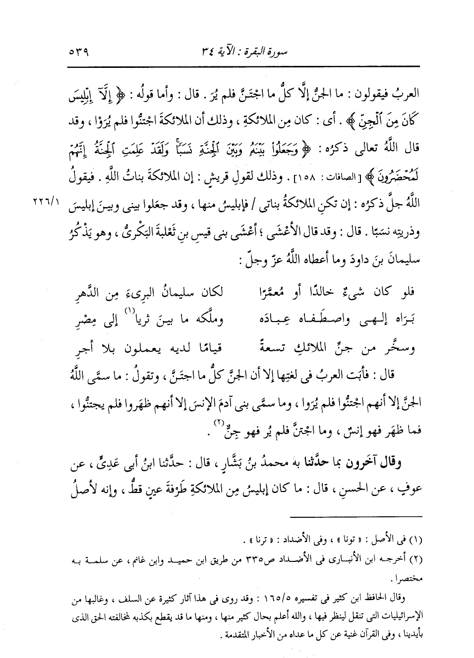 الْعَرَبُ فَيَقُولُونَ: مَا الْجِنُّ إِلَّا كُلُّ مَنِ اجْتَنَّ فَلَمْ يُرَ. وَأَمَّا قَوْلُهُ: {§إِلَّا إِبْلِيسَ كَانَ مِنَ الْجِنِّ} [الكهف: 50] أَيْ كَانَ مِنَ الْمَلَائِكَةِ، وَذَلِكَ أَنَّ الْمَلَائِكَةَ اجْتَنُّوا فَلَمْ يُرَوْا، وَقَدْ قَالَ اللَّهُ جَلَّ ثَنَاؤُهُ {وَجَعَلُوا بَيْنَهُ وَبَيْنَ الْجِنَّةِ نَسَبًا وَلَقَدْ عَلِمَتِ الْجِنَّةُ إِنَّهُمْ لَمُحْضَرُونَ} [الصافات: 158] وَذَلِكَ لِقَوْلِ قُرَيْشٍ: إِنَّ الْمَلَائِكَةَ بَنَاتُ اللَّهِ. فَيَقُولُ اللَّهُ: إِنْ تَكُنِ الْمَلَائِكَةُ بَنَاتِي فَإِبْلِيسُ مِنْهَا، وَقَدْ جَعَلُوا بَيْنِي وَبَيْنَ إِبْلِيسَ وَذُرِّيَّتِهِ نَسَبًا. قَالَ: وَقَدْ قَالَ الْأَعْشَى أَعْشَى بَنِي قَيْسِ بْنِ ثَعْلَبَةَ الْبَكْرِيُّ، وَهُوَ يَذْكُرُ سُلَيْمَانَ بْنَ دَاوُدَ وَمَا أَعْطَاهُ اللَّهُ:
