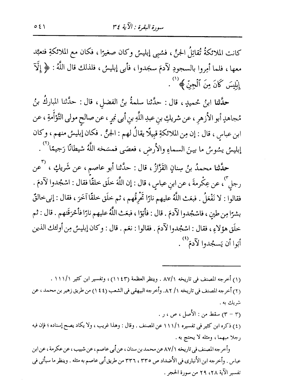 وَحَدَّثَنَا ابْنُ حُمَيْدٍ، قَالَ: حَدَّثَنَا سَلَمَةُ بْنُ الْفَضْلِ، قَالَ: حَدَّثَنَا الْمُبَارَكُ بْنُ مُجَاهِدٍ أَبُو الْأَزْهَرِ، عَنْ شَرِيكِ بْنِ عَبْدِ اللَّهِ بْنِ أَبِي نَمِرٍ، عَنْ صَالِحٍ، مَوْلَى التَّوْأَمَةِ، عَنِ ابْنِ عَبَّاسٍ، قَالَ: «إِنَّ §مِنَ الْمَلَائِكَةِ قَبِيلًا يُقَالُ لَهُمُ الْجِنُّ، فَكَانَ إِبْلِيسُ مِنْهُمْ، وَكَانَ إِبْلِيسُ يَسُوسُ مَا بَيْنَ السَّمَاءِ وَالْأَرْضِ فَعَصَى، فَمَسَخَهُ اللَّهُ شَيْطَانًا رَجِيمًا»