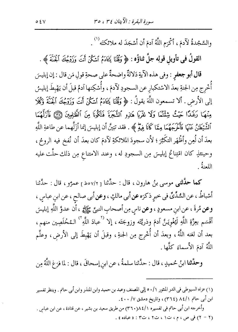 §الْقَوْلُ فِي تَأْوِيلِ قَوْلِهِ تَعَالَى: {وَقُلْنَا يَا آدَمُ اسْكُنْ أَنْتَ وَزَوْجَكَ الْجَنَّةَ وَكُلَا مِنْهَا رَغَدًا حَيْثُ شِئْتُمَا وَلَا تَقْرَبَا هَذِهِ الشَّجَرَةَ فَتَكُونَا مِنَ الظَّالِمِينَ} [البقرة: 35] قَالَ أَبُو جَعْفَرٍ: وَفِي هَذِهِ الْآيَةِ دَلَالَةٌ وَاضِحَةٌ عَلَى صِحَّةِ قَوْلِ مَنْ قَالَ: إِنَّ إِبْلِيسَ أُخْرِجَ مِنَ الْجَنَّةِ بَعْدَ الِاسْتِكْبَارِ عَنِ السُّجُودِ لِآدَمَ، وَأَسْكَنَهَا آدَمَ قَبْلَ أَنْ يُهْبِطَ إِبْلِيسَ إِلَى الْأَرْضِ؛ أَلَا تَسْمَعُونَ اللَّهَ جَلَّ ثَنَاؤُهُ يَقُولُ: {وَقُلْنَا يَا آدَمُ اسْكُنْ أَنْتَ وَزَوْجُكَ الْجَنَّةَ وَكُلَا مِنْهَا رَغَدًا حَيْثُ شِئْتُمَا وَلَا تَقْرَبَا هَذِهِ الشَّجَرَةَ فَتَكُونَا مِنَ الظَّالِمِينَ فَأَزَلَّهُمَا الشَّيْطَانُ عَنْهَا فَأَخْرَجَهُمَا مِمَّا كَانَا فِيهِ} [البقرة: 36] فَقَدْ تَبَيَّنَ أَنَّ إِبْلِيسَ إِنَّمَا أَزَلَّهُمَا عَنْ طَاعَةِ اللَّهِ، بَعْدَ أَنْ لُعِنَ وَأَظْهَرَ التَّكَبُّرَ؛ لِأَنَّ سُجُودَ الْمَلَائِكَةِ لِآدَمَ كَانَ بَعْدَ أَنْ نَفَخَ فِيهِ الرُّوحَ، وَحِينَئِذٍ كَانَ امْتِنَاعُ إِبْلِيسَ مِنَ السُّجُودِ لَهُ، وَعِنْدَ الِامْتِنَاعِ مِنْ ذَلِكَ حَلَّتْ عَلَيْهِ اللَّعْنَةُ