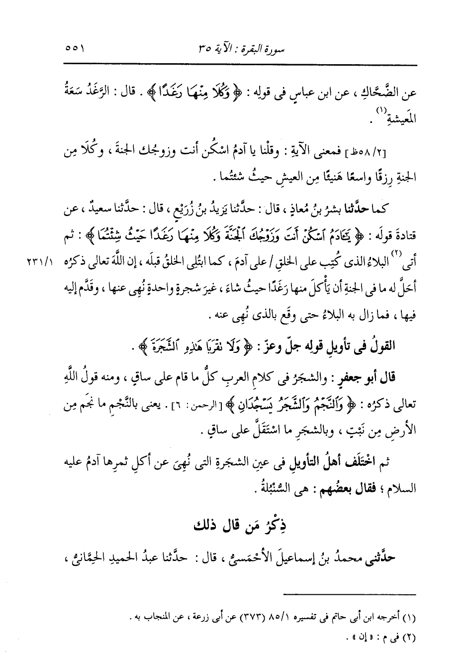 §الْقَوْلُ فِي تَأْوِيلِ قَوْلِهِ تَعَالَى: {وَلَا تَقْرَبَا هَذِهِ الشَّجَرَةَ} [البقرة: 35] قَالَ أَبُو جَعْفَرٍ: وَالشَّجَرُ فِي كَلَامِ الْعَرَبِ: كُلُّ مَا قَامَ عَلَى سَاقٍ، وَمِنْهُ قَوْلُ اللَّهِ جَلَّ ثَنَاؤُهُ: {وَالنَّجْمُ وَالشَّجَرُ يَسْجُدَانِ} [الرحمن: 6] يَعْنِي بِالنَّجْمِ: مَا نَجَمَ مِنَ الْأَرْضِ مِنْ نَبْتٍ. وَبِالشَّجَرِ: مَا اسْتَقَلَّ عَلَى سَاقٍ. ثُمَّ اخْتَلَفَ أَهْلُ التَّأْوِيلِ فِي عَيْنِ الشَّجَرَةِ الَّتِي نُهِيَ عَنْ أَكْلِ ثَمَرِهَا آدَمُ، فَقَالَ بَعْضُهُمْ هِيَ السُّنْبُلَةُ