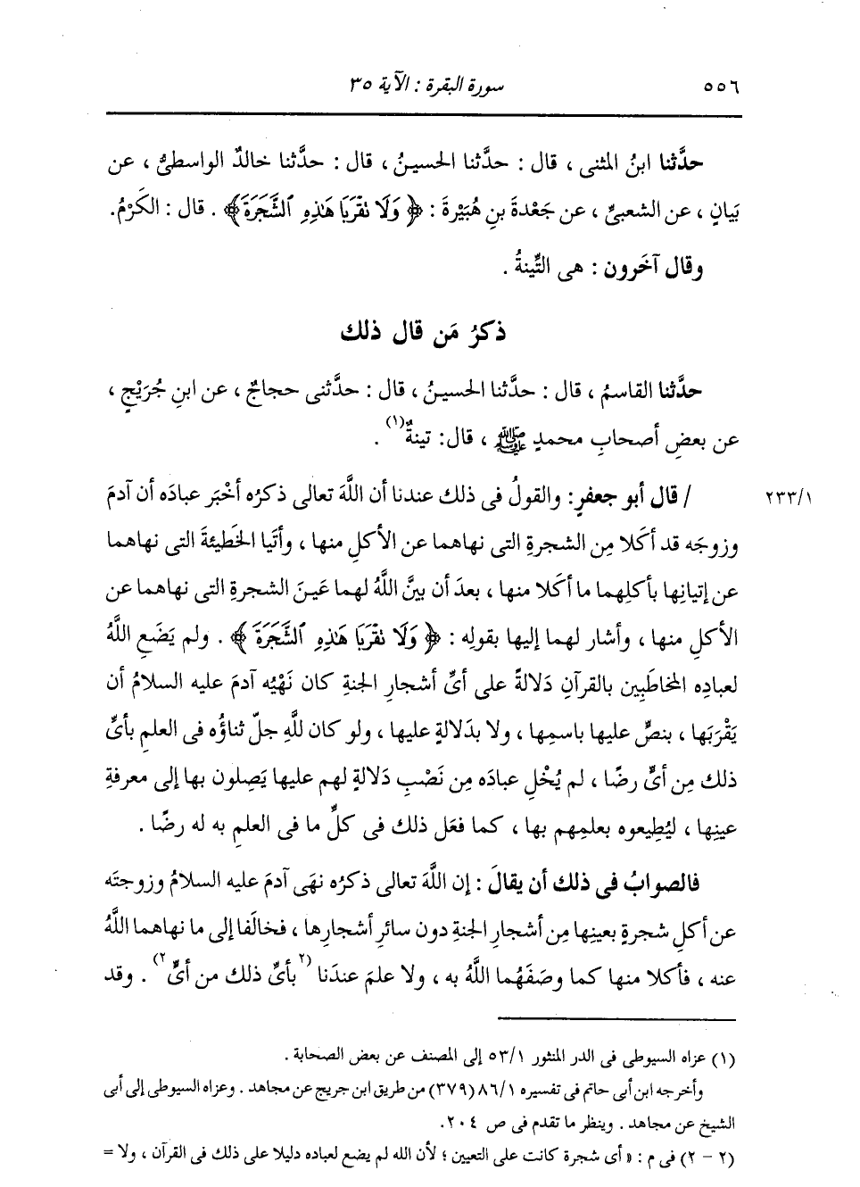 ذِكْرُ مَنْ قَالَ ذَلِكَ حَدَّثَنَا الْقَاسِمُ، قَالَ: حَدَّثَنَا الْحُسَيْنُ، قَالَ: حَدَّثَنِي حَجَّاجٌ، عَنِ ابْنِ جُرَيْجٍ، عَنْ بَعْضِ أَصْحَابِ النَّبِيِّ صَلَّى اللهُ عَلَيْهِ وَسَلَّمَ قَالَ: «§تِينَةٌ» قَالَ أَبُو جَعْفَرٍ: وَالْقَوْلُ فِي ذَلِكَ عِنْدَنَا أَنَّ اللَّهَ جَلَّ ثَنَاؤُهُ أَخْبَرَ عِبَادَهُ أَنَّ آدَمَ وَزَوْجَتَهُ أَكَلَا مِنَ الشَّجَرَةِ الَّتِي نَهَاهُمَا رَبُّهُمَا عَنِ الْأَكْلِ مِنْهَا، فَأَتَيَا الْخَطِيئَةَ الَّتِي نَهَاهُمَا عَنْ إِتْيَانِهَا بِأَكْلِهِمَا مَا أَكَلَا مِنْهَا، بَعْدَ أَنْ بَيَّنَ اللَّهُ جَلَّ ثَنَاؤُهُ لَهُمَا عَيْنَ الشَّجَرَةِ الَّتِي نَهَاهُمَا عَنِ الْأَكْلِ مِنْهَا وَأَشَارَ لَهُمَا إِلَيْهَا بِقَوْلِهِ: {وَلَا تَقْرَبَا هَذِهِ الشَّجَرَةَ} [البقرة: 35] وَلَمْ يَضَعِ اللَّهُ جَلَّ ثَنَاؤُهُ لِعِبَادِهِ الْمُخَاطَبِينَ بِالْقُرْآنِ دَلَالَةً عَلَى أَيِّ أَشْجَارِ الْجَنَّةِ كَانَ نَهْيُهُ آدَمَ أَنْ يَقْرَبَهَا بِنَصٍّ عَلَيْهَا بِاسْمِهَا وَلَا بِدَلَالَةٍ عَلَيْهَا. وَلَوْ كَانَ لِلَّهِ فِي الْعِلْمِ بِأَيِّ ذَلِكَ مِنْ أَيِّ رِضًا لَمْ يُخْلِ عِبَادَهُ مِنْ نَصْبِ دَلَالَةٍ لَهُمْ عَلَيْهَا يَصِلُونَ بِهَا إِلَى مَعْرِفَةِ عَيْنِهَا، لِيُطِيعُوهُ بِعِلْمِهِمْ بِهَا، كَمَا فَعَلَ ذَلِكَ فِي كُلِّ مَا بِالْعِلْمِ بِهِ لَهُ رِضًا. فَالصَّوَابُ فِي ذَلِكَ أَنْ يُقَالَ: إِنَّ اللَّهَ جَلَّ ثَنَاؤُهُ نَهَى آدَمَ وَزَوْجَتَهُ عَنْ أَكْلِ شَجَرَةٍ بِعَيْنِهَا مِنْ أَشْجَارِ الْجَنَّةِ دُونَ سَائِرِ أَشْجَارِهَا، فَخَالَفَا إِلَى مَا نَهَاهُمَا اللَّهُ عَنْهُ، فَأَكَلَا مِنْهَا كَمَا وَصَفَهُمَا اللَّهُ جَلَّ ثَنَاؤُهُ بِهِ. وَلَا عِلْمَ عِنْدَنَا أَيَّ شَجَرَةٍ كَانَتْ عَلَى التَّعْيِينِ، لِأَنَّ اللَّهَ لَمْ يَضَعْ لِعِبَادِهِ دَلِيلًا عَلَى ذَلِكَ فِي الْقُرْآنِ وَلَا فِي السُّنَّةِ الصَّحِيحَةِ، فَأَنَّى يَأْتِي ذَلِكَ مَنْ أَتَى؟ وَقَدْ