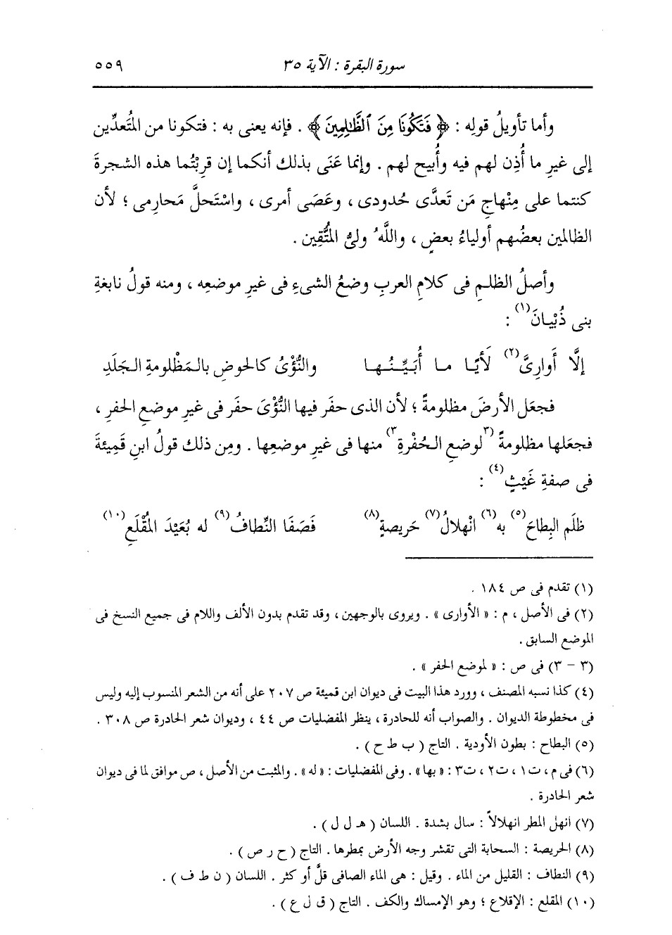 §وَأَمَّا تَأْوِيلُ قَوْلِهِ: {فَتَكُونَا مِنَ الظَّالِمِينَ} [البقرة: 35] فَإِنَّهُ يَعْنِي بِهِ فَتَكُونَا مِنَ الْمُتَعَدِّينَ إِلَى غَيْرِ مَا أُذِنَ لَهُمْ وَأُبِيحَ لَهُمْ فِيهِ. وَإِنَّمَا عَنَى بِذَلِكَ أَنَّكُمَا إِنْ قَرُبْتُمَا هَذِهِ الشَّجَرَةَ كُنْتُمَا عَلَى مِنْهَاجِ مَنْ تَعَدَّى حُدُودِي وَعَصَى أَمْرِي وَاسْتَحَلَّ مَحَارِمِي؛ لِأَنَّ الظَّالِمِينَ بَعْضُهُمْ أَوْلِيَاءُ بَعْضٍ، وَاللَّهُ وَلِيُّ الْمُتَّقِينَ وَأَصْلُ الظُّلْمِ فِي كَلَامِ الْعَرَبِ وَضْعُ الشَّيْءِ فِي غَيْرِ مَوْضِعِهِ وَمِنْهُ قَوْلُ نَابِغَةِ بَنِي ذُبْيَانَ: