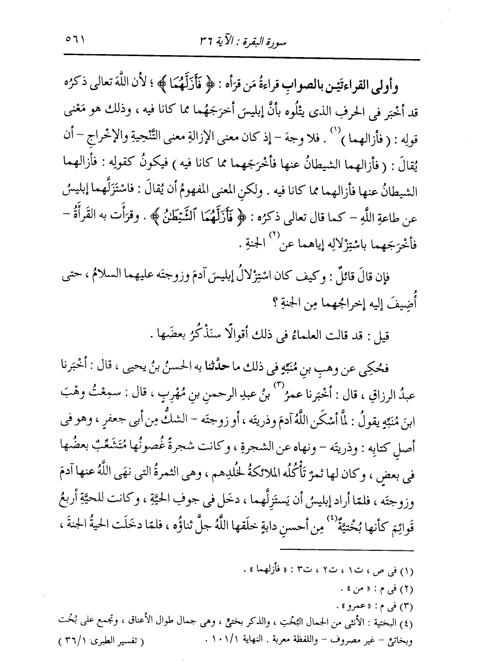 فَحُكِيَ عَنْ وَهْبِ بْنِ مُنَبِّهٍ فِي ذَلِكَ مَا حَدَّثَنَا بِهِ الْحَسَنُ بْنُ يَحْيَى، قَالَ: أَخْبَرَنَا عَبْدُ الرَّزَّاقِ، قَالَ: أَخْبَرَنَا عُمَرُ بْنُ عَبْدِ الرَّحْمَنِ بْنِ مُهَرِّبٍ، قَالَ: سَمِعْتُ وَهْبَ بْنَ مُنَبِّهٍ: " يَقُولُ: §لَمَّا أَسْكَنَ اللَّهُ آدَمَ وَذُرِّيَّتَهُ، أَوْ زَوْجَتَهُ - الشَّكُّ مِنْ أَبِي جَعْفَرٍ - وَهُوَ فِي أَصْلِ كِتَابِهِ: وَذُرِّيَّتَهُ، وَنَهَاهُ عَنِ الشَّجَرَةِ، وَكَانَتِ شَجَرَةً غُصُونُهَا مُتَشَعِّبٌ بَعْضُهَا فِي بَعْضٍ، وَكَانَ لَهَا ثَمَرٌ تَأْكُلُهُ الْمَلَائِكَةُ لِخُلْدِهِمْ، وَهِيَ الثَّمَرَةُ الَّتِي نَهَى اللَّهُ آدَمَ عَنْهَا وَزَوْجَتَهُ. فَلَمَّا أَرَادَ إِبْلِيسُ أَنْ يَسْتَزِلَّهُمَا دَخَلَ فِي جَوْفِ الْحَيَّةِ، وَكَانَتْ لِلْحَيَّةِ أَرْبَعَةُ قَوَائِمَ كَأَنَّهَا بُخْتِيَّةٌ مِنْ أَحْسَنِ دَابَّةٍ خَلَقَهَا اللَّهُ. فَلَمَّا دَخَلَتِ الْحَيَّةُ الْجَنَّةَ، -[562]- خَرَجَ مِنْ جَوْفِهَا إِبْلِيسُ، فَأَخَذَ مِنَ الشَّجَرَةِ الَّتِي نَهَى اللَّهُ عَنْهَا آدَمَ وَزَوْجَتَهُ، فَجَاءَ بِهَا إِلَى حَوَّاءَ، فَقَالَ: انْظُرِي إِلَى هَذِهِ الشَّجَرَةِ، مَا أَطْيَبَ رِيحَهَا، وَأَطْيَبَ طَعْمَهَا، وَأَحْسَنَ لَوْنَهَا. فَأَخَذَتْ حَوَّاءُ فَأَكَلَتْ مِنْهَا، ثُمَّ ذَهَبَتْ بِهَا إِلَى آدَمَ، فَقَالَتِ: انْظُرْ إِلَى هَذِهِ الشَّجَرَةِ، مَا أَطْيَبَ رِيحَهَا، وَأَطْيَبَ طَعْمَهَا، وَأَحْسَنَ لَوْنَهَا. فَأَكَلَ مِنْهَا آدَمُ، فَبَدَتْ لَهُمَا سَوْآتُهُمَا، فَدَخَلَ آدَمُ فِي جَوْفِ الشَّجَرَةِ، فَنَادَاهُ رَبُّهُ: يَا آدَمُ أَيْنَ أَنْتَ؟ قَالَ: أَنَا هُنَا يَا رَبِّ، قَالَ: أَلَا تَخْرُجُ؟ قَالَ: أَسْتَحْيِي مِنْكَ يَا رَبُّ، قَالَ: مَلْعُونَةٌ الْأَرْضُ الَّتِي خُلِقْتَ مِنْهَا لَعْنَةً يَتَحَوَّلُ ثَمَرُهَا شَوْكًا. قَالَ: وَلَمْ يَكُنْ فِي الْجَنَّةِ وَلَا فِي الْأَرْضِ شَجَرَةٌ كَانَ أَفْضَلَ مِنَ الطَّلْحِ وَالسِّدْرِ؛ ثُمَّ قَالَ: يَا حَوَّاءُ أَنْتِ الَّتِي غَرَّرْتِ عَبْدِي، فَإِنَّكِ لَا تَحْمِلِينَ حَمْلًا إِلَّا حَمَلْتِهِ كَرْهًا، فَإِذَا أَرَدْتِ أَنْ تَضَعِيَ مَا فِي بَطْنِكَ أَشْرَفْتِ عَلَى الْمَوْتِ مِرَارًا. وَقَالَ لِلْحَيَّةِ: أَنْتِ الَّتِي دَخَلَ الْمَلْعُونُ فِي جَوْفِكِ حَتَّى غَرَّ عَبْدِي، مَلْعُونَةٌ أَنْتِ لَعْنَةً تَتَحَوَّلُ قَوَائِمُكِ فِي بَطْنِكِ، وَلَا يَكُنْ لَكِ رِزْقٌ إِلَّا التُّرَابَ، أَنْتِ عَدُوَّةُ بَنِي آدَمَ وَهُمْ أَعْدَاؤُكِ، حَيْثُ لَقِيتِ أَحَدًا مِنْهُمْ أَخَذْتِ بِعَقِبِهِ وَحَيْثُ لَقِيَكِ شَدَخَ رَأْسَكِ. قَالَ عُمَرُ: قِيلَ لِوَهْبٍ: وَمَا كَانَتِ الْمَلَائِكَةُ تَأْكُلُ؟ قَالَ: يَفْعَلُ اللَّهُ مَا يَشَاءُ " وَرُوِي عَنِ ابْنِ عَبَّاسٍ نَحْوُ هَذِهِ الْقِصَّةِ