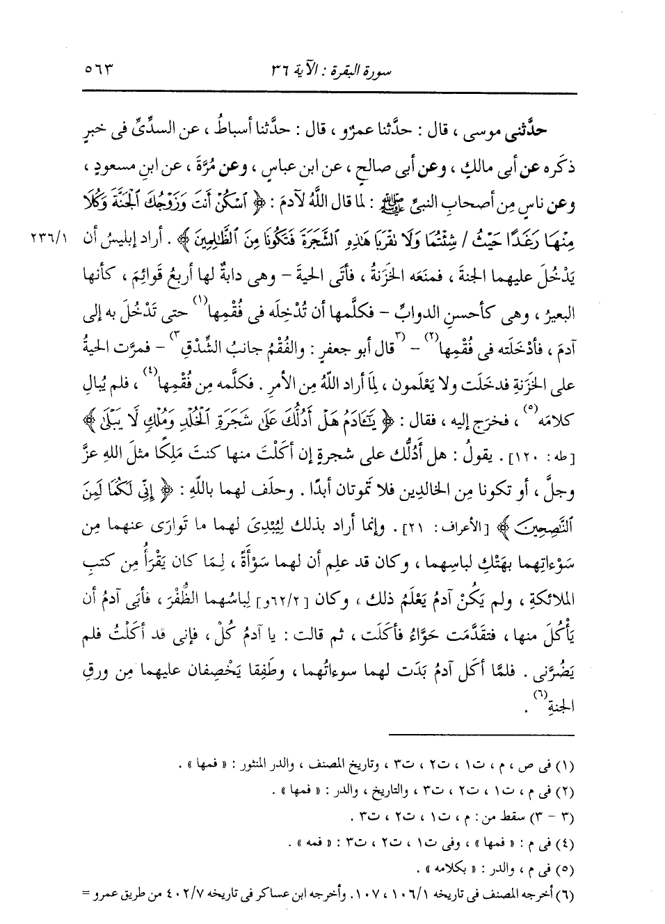 حَدَّثَنِي مُوسَى بْنُ هَارُونَ، قَالَ: حَدَّثَنَا عَمْرٌو، قَالَ: حَدَّثَنَا أَسْبَاطٌ، عَنِ السُّدِّيِّ، فِي خَبَرٍ ذَكَرَهُ عَنْ أَبِي مَالِكٍ، وَعَنْ أَبِي صَالِحٍ، عَنِ ابْنِ عَبَّاسٍ، وَعَنْ مُرَّةَ، عَنِ ابْنِ مَسْعُودٍ، وَعَنْ نَاسٍ، مِنْ أَصْحَابِ النَّبِيِّ صَلَّى اللهُ عَلَيْهِ وَسَلَّمَ: " لَمَّا قَالَ اللَّهُ لِآدَمَ: {§اسْكُنْ أَنْتَ وَزَوْجُكَ الْجَنَّةَ وَكُلَا مِنْهَا رَغَدًا حَيْثُ شِئْتُمَا وَلَا تَقْرَبَا هَذِهِ الشَّجَرَةَ فَتَكُونَا مِنَ الظَّالِمِينَ} [البقرة: 35] ، أَرَادَ إِبْلِيسُ أَنْ يَدْخُلَ عَلَيْهِمَا الْجَنَّةَ فَمَنَعَتْهُ الْخَزَنَةُ، فَأَتَى الْحَيَّةَ وَهِيَ دَابَّةٌ لَهَا أَرْبَعُ قَوَائِمَ كَأَنَّهَا الْبَعِيرُ، وَهِيَ كَأَحْسَنِ الدَّوَابِّ، فَكَلَّمَهَا أَنْ تُدْخِلَهُ فِي فَمِهَا حَتَّى تَدْخُلَ بِهِ إِلَى آدَمَ، فَأَدْخَلَتْهُ فِي فَمِهَا، فَمَرَّتِ الْحَيَّةُ عَلَى الْخَزَنَةِ فَدَخَلَتْ وَلَا يَعْلَمُونَ؛ لِمَا أَرَادَ اللَّهُ مِنَ الْأَمْرِ، فَكَلَّمَهُ مِنْ فَمِهَا فَلَمْ يُبَالِ بِكَلَامِهِ، فَخَرَجَ إِلَيْهِ فَقَالَ: {يَا آدَمُ هَلْ أَدُلُّكَ عَلَى شَجَرَةِ الْخُلْدِ وَمُلْكٍ لَا يَبْلَى} [طه: 120] ، يَقُولُ: هَلْ أَدُلُّكَ عَلَى شَجَرَةٍ إِنْ أَكَلْتَ مِنْهَا كُنْتَ مَلِكًا مِثْلَ اللَّهِ عَزَّ وَجَلَّ، أَوْ تَكُونَا مِنَ الْخَالِدِينَ فَلَا تَمُوتَانِ أَبَدًا. وَحَلَفَ لَهُمَا بِاللَّهِ: إِنِّي لَكُمَا لَمِنَ النَّاصِحِينَ، وَإِنَّمَا أَرَادَ بِذَلِكَ لِيُبْدِيَ لَهُمَا مَا تَوَارَى عَنْهُمَا مِنْ سَوْآتِهِمَا بِهَتْكِ لِبَاسِهِمَا. وَكَانَ قَدْ عَلِمَ أَنَّ لَهُمَا سَوْأَةً لِمَا كَانَ يَقْرَأُ مِنْ كُتُبِ الْمَلَائِكَةِ، وَلَمْ يَكُنْ آدَمُ يَعْلَمُ ذَلِكَ، وَكَانَ لِبَاسُهُمَا الظُّفُرَ. فَأَبَى آدَمُ أَنْ يَأْكُلَ مِنْهَا، فَتَقَدَّمَتْ حَوَّاءُ فَأَكَلَتْ ثُمَّ قَالَتْ: يَا آدَمُ كُلْ؛ فَإِنِّي قَدْ أَكَلْتُ فَلَمْ يَضُرَّنِي. فَلَمَّا أَكَلَ آدَمُ {بَدَتْ لَهُمَا سَوْآتُهُمَا وَطَفِقَا يَخْصِفَانِ عَلَيْهِمَا مِنْ وَرَقِ الْجَنَّةِ} "