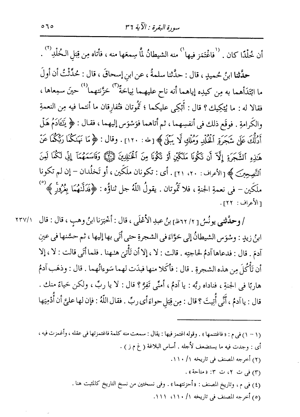 وَحَدَّثَنِي يُونُسُ بْنُ عَبْدِ الْأَعْلَى، قَالَ: أَخْبَرَنَا ابْنُ وَهْبٍ، قَالَ: قَالَ ابْنُ زَيْدٍ: " §وَسْوَسَ الشَّيْطَانُ إِلَى حَوَّاءَ فِي الشَّجَرَةِ حَتَّى أَتَى بِهَا إِلَيْهَا، ثُمَّ حَسَّنَهَا فِي عَيْنِ آدَمَ. قَالَ: فَدَعَاهَا آدَمُ لِحَاجَتِهِ، قَالَتْ: لَا، إِلَّا أَنْ تَأْتِيَ هَهُنَا. فَلَمَّا أَتَى قَالَتْ: لَا، إِلَّا أَنْ تَأْكُلَ مِنْ هَذِهِ الشَّجَرَةِ، قَالَ: فَأَكَلَا مِنْهَا فَبَدَتْ لَهُمَا سَوْآتُهُمَا. قَالَ: وَذَهَبَ آدَمُ هَارِبًا فِي الْجَنَّةِ، فَنَادَاهُ رَبُّهُ: يَا آدَمُ أَمِنِّي تَفِرُّ؟ قَالَ: لَا يَا رَبِّ، وَلَكِنْ حَيَاءً مِنْكَ. قَالَ: يَا آدَمُ أَنَّى أُتِيتَ؟ قَالَ: مِنْ قِبَلِ حَوَّاءَ أَيْ رَبِّ. فَقَالَ اللَّهُ: فَإِنَّ لَهَا عَلَيَّ أَنْ آدَمَيَهَا