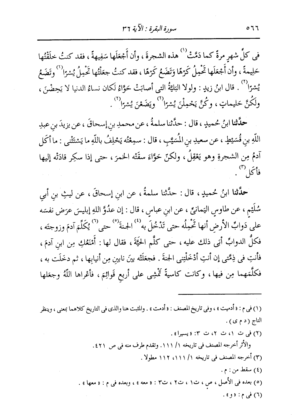 وَحَدَّثَنَا ابْنُ حُمَيْدٍ، قَالَ: حَدَّثَنَا سَلَمَةُ، عَنْ مُحَمَّدِ بْنِ إِسْحَاقَ، عَنْ يَزِيدَ بْنِ عَبْدِ اللَّهِ بْنِ قُسَيْطٍ، عَنْ سَعِيدِ بْنِ الْمُسَيِّبِ، قَالَ: «سَمِعْتُهُ يَحْلِفُ بِاللَّهِ مَا يَسْتَثْنِي §مَا أَكَلَ آدَمُ مِنَ الشَّجَرَةِ وَهُوَ يَعْقِلُ، وَلَكِنَّ حَوَّاءَ سَقَتْهُ الْخَمْرَ حَتَّى إِذَا سَكِرَ قَادَتْهُ إِلَيْهَا فَأَكَلَ»