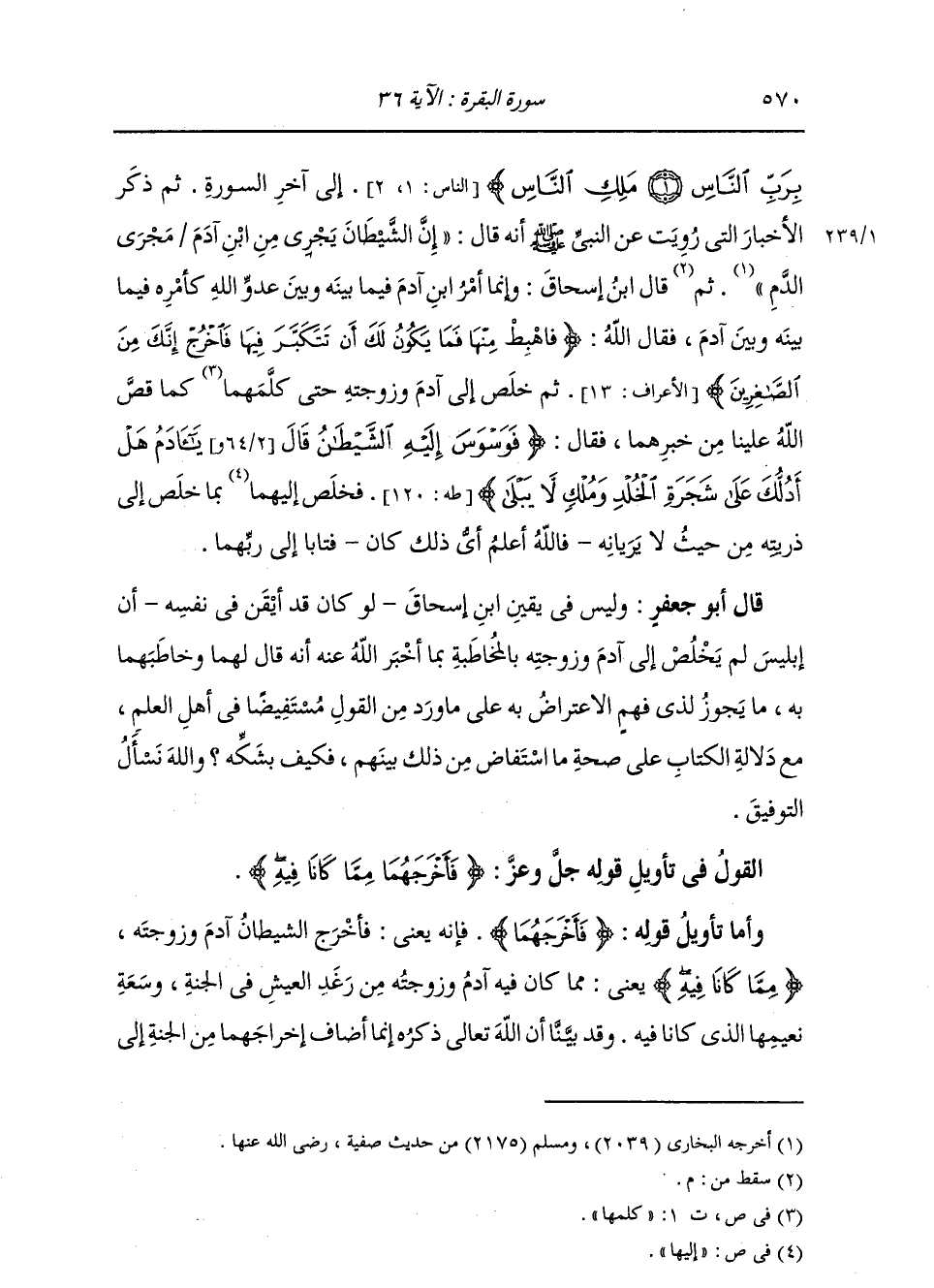 بِرَبِّ النَّاسِ مَلِكِ النَّاسِ} [الناس: 2] إِلَى آخِرِ السُّورَةِ " ثُمَّ ذَكَرَ الْأَخْبَارَ الَّتِي رُوِيَتْ عَنِ النَّبِيِّ صَلَّى اللهُ عَلَيْهِ وَسَلَّمَ أَنَّهُ قَالَ: «إِنَّ الشَّيْطَانَ يَجْرِي مِنَ ابْنِ آدَمَ مَجْرَى الدَّمِ» قَالَ ابْنُ إِسْحَاقَ: وَإِنَّمَا أَمْرُ ابْنِ آدَمَ فِيمَا بَيْنَهُ وَبَيْنَ عَدُوِّ اللَّهِ، كَأَمْرِهِ فِيمَا بَيْنَهُ وَبَيْنَ آدَمَ، فَقَالَ اللَّهُ: {فَاهْبِطْ مِنْهَا فَمَا يَكُونُ لَكَ أَنْ تَتَكَبَّرَ فِيهَا فَاخْرُجْ إِنَّكَ مِنَ الصَّاغِرِينَ} [الأعراف: 13] ثُمَّ خَلَصَ إِلَى آدَمَ وَزَوْجَتِهِ حَتَّى كَلَّمَهُمَا، كَمَا قَصَّ اللَّهُ عَلَيْنَا مِنْ خَبَرِهِمَا، قَالَ: {فَوَسْوَسَ إِلَيْهِ الشَّيْطَانُ قَالَ يَا آدَمُ هَلْ أَدُلُّكَ عَلَى شَجَرَةِ الْخُلْدِ وَمُلْكٍ لَا يَبْلَى} [طه: 120] فَخَلَصَ إِلَيْهِمَا بِمَا خَلَصَ إِلَى ذُرِّيَّتِهِ مِنْ حَيْثُ لَا يَرَيَانِهِ، وَاللَّهُ أَعْلَمُ أَيُّ ذَلِكَ كَانَ؛ فَتَابَا إِلَى رَبِّهِمَا قَالَ أَبُو جَعْفَرٍ: وَلَيْسَ فِي يَقِينِ ابْنِ إِسْحَاقَ لَوْ كَانَ قَدْ أَيْقَنَ فِي نَفْسِهِ أَنَّ إِبْلِيسَ لَمْ يَخْلُصْ إِلَى آدَمَ وَزَوْجَتِهِ بِالْمُخَاطَبَةِ بِمَا أَخْبَرَ اللَّهُ عَنْهُ أَنَّهُ قَالَ لَهُمَا وَخَاطَبَهُمَا بِهِ مَا يَجُوزُ لِذِي فَهْمٍ الِاعْتِرَاضُ بِهِ عَلَى مَا وَرَدَ مِنَ الْقَوْلِ مُسْتَفِيضًا مِنْ أَهْلِ الْعِلْمِ مَعَ دَلَالَةِ الْكِتَابِ عَلَى صِحَّةِ مَا اسْتَفَاضَ مِنْ ذَلِكَ بَيْنَهُمْ، فَكَيْفَ بِشَكِّهِ؟ وَاللَّهَ نَسْأَلُ التَّوْفِيقَ