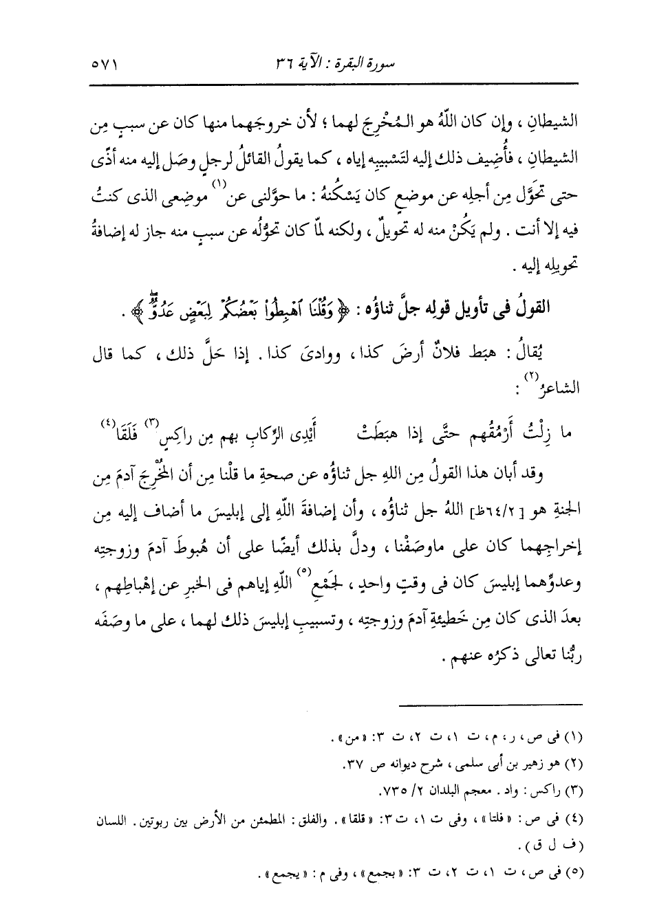 §الْقَوْلُ فِي تَأْوِيلِ قَوْلِهِ تَعَالَى: {وَقُلْنَا اهْبِطُوا بَعْضُكُمْ لِبَعْضٍ عَدُوٌّ} [البقرة: 36] قَالَ أَبُو جَعْفَرٍ: يُقَالُ: هَبَطَ فُلَانٌ أَرْضَ كَذَا وَوَادِي كَذَا: إِذَا حَلَّ ذَلِكَ كَمَا قَالَ الشَّاعِرُ: