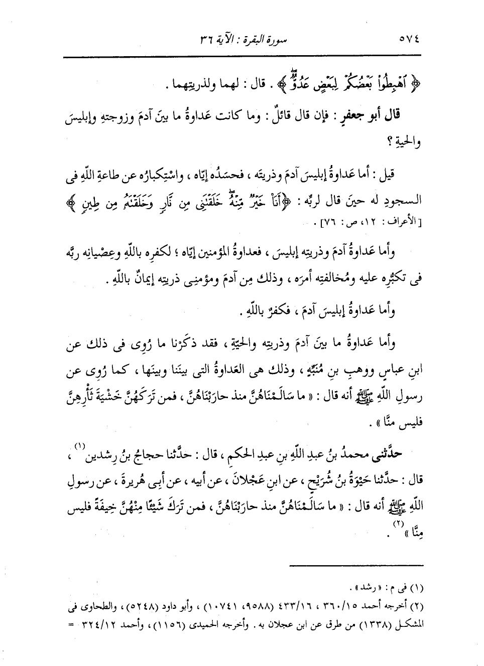 حَدَّثَنِي مُحَمَّدُ بْنُ عَبْدِ اللَّهِ بْنِ عَبْدِ الْحَكَمِ، قَالَ: حَدَّثَنِي حَجَّاجُ بْنُ رَشَدٍ، قَالَ: حَدَّثَنَا حَيْوَةُ بْنُ شُرَيْحٍ، عَنِ ابْنِ عَجْلَانَ، عَنْ أَبِيهِ، عَنْ أَبِي هُرَيْرَةَ، عَنْ رَسُولِ اللَّهِ صَلَّى اللهُ عَلَيْهِ وَسَلَّمَ أَنَّهُ قَالَ: «§مَا سَالَمْنَاهُنَّ مُنْذُ حَارَبْنَاهُنَّ، فَمَنْ تَرَكَ شَيْئًا مِنْهُنَّ خِيفَةً فَلَيْسَ مِنَّا» -[575]- قَالَ أَبُو جَعْفَرٍ: وَأَحْسِبُ أَنَّ الْحَرْبَ الَّتِي بَيْنَنَا كَانَ أَصْلُهُ مَا ذَكَرَهُ عُلَمَاؤُنَا الَّذِينَ قَدَّمْنَا الرِّوَايَةَ عَنْهُمْ فِي إِدْخَالِهَا إِبْلِيسَ الْجَنَّةَ بَعْدَ أَنْ أَخْرَجَهُ اللَّهُ مِنْهَا حَتَّى اسْتَزَلَّهُ عَنْ طَاعَةِ رَبِّهِ فِي أَكْلِهِ مَا نُهِيَ عَنْ أَكْلِهِ مِنَ الشَّجَرَةِ