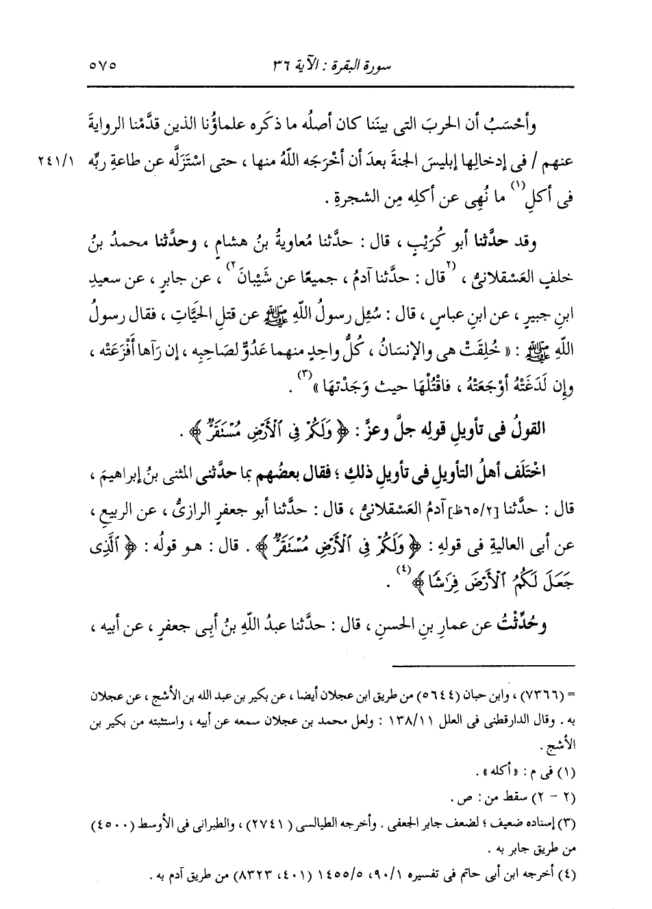 §الْقَوْلُ فِي تَأْوِيلِ قَوْلِهِ تَعَالَى: {وَلَكُمْ فِي الْأَرْضِ مُسْتَقَرٌّ} [البقرة: 36] قَالَ أَبُو جَعْفَرٍ: اخْتَلَفَ أَهْلُ التَّأْوِيلِ فِي تَأْوِيلِ ذَلِكَ. فَقَالَ بَعْضُهُمْ بِمَا