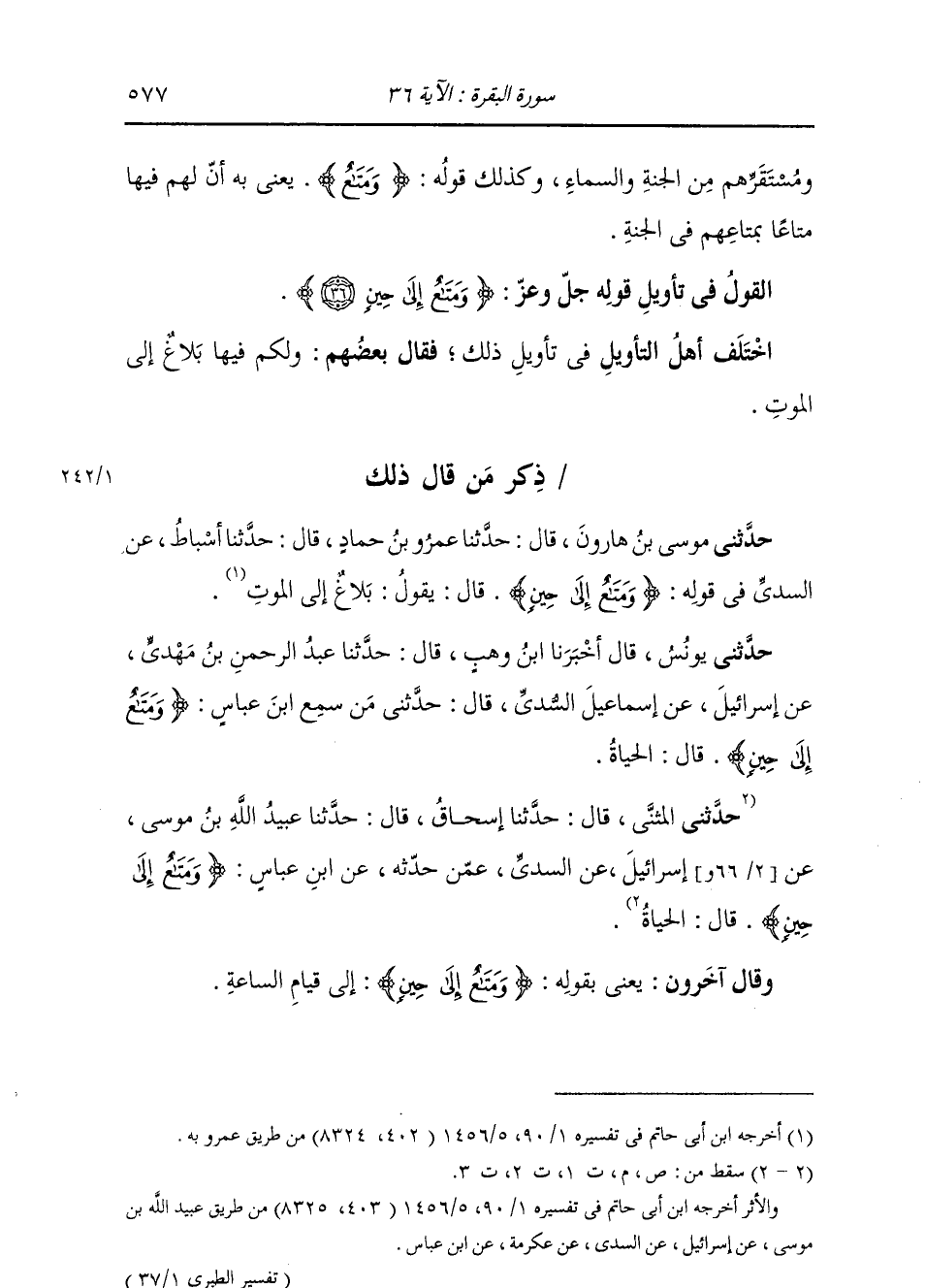 ذِكْرُ مَنْ قَالَ ذَلِكَ حَدَّثَنِي مُوسَى بْنُ هَارُونَ، قَالَ: حَدَّثَنَا عَمْرُو بْنُ حَمَّادٍ، قَالَ: حَدَّثَنَا أَسْبَاطٌ، عَنِ السُّدِّيِّ: " فِي قَوْلِهِ: {§وَمَتَاعٌ إِلَى حِينٍ} [البقرة: 36] قَالَ يَقُولُ: بَلَاغٌ إِلَى الْمَوْتِ "