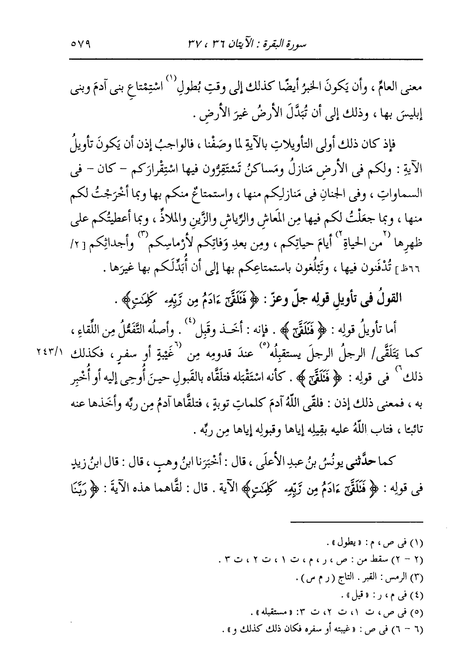 §أَمَّا تَأْوِيلُ قَوْلِهِ: {فَتَلَقَّى آدَمُ} [البقرة: 37] فَقِيلَ إِنَّهُ أَخَذَ وَقَبِلَ، وَأَصْلُهُ التَّفَعُّلَ مِنَ اللِّقَاءِ كَمَا يَتَلَقَّى الرَّجُلُ الرَّجُلَ يَسْتَقْبِلُهُ عِنْدَ قُدُومِهِ مِنْ غِيبَةٍ أَوْ سَفَرٍ، فَكَذَلِكَ ذَلِكَ فِي قَوْلِهِ: {فَتَلَقَّى} [البقرة: 37] كَأَنَّهُ اسْتَقْبَلَهُ فَتَلَقَّاهُ بِالْقَبُولِ، حِينَ أَوْحَى إِلَيْهِ، أَوْ أَخْبَرَ بِهِ. فَمَعْنَى ذَلِكَ إِذًا: فَلَقَّى اللَّهُ آدَمَ كَلِمَاتِ تَوْبَةٍ فَتَلَقَّاهَا آدَمُ مِنْ رَبِّهِ وَأَخَذَهَا عَنْهُ تَائِبًا فَتَابَ اللَّهُ عَلَيْهِ بِقِيلِهِ إِيَّاهَا وَقَبُولِهِ إِيَّاهَا مِنْ رَبِّهِ