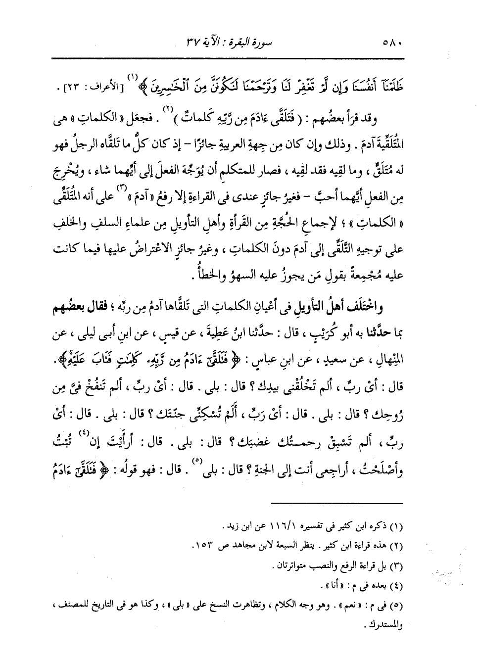 فَقَالَ بَعْضُهُمْ بِمَا حَدَّثَنَا بِهِ أَبُو كُرَيْبٍ، قَالَ: حَدَّثَنَا ابْنُ عَطِيَّةَ، عَنْ قَيْسٍ، عَنِ ابْنِ أَبِي لَيْلَى، عَنِ الْمِنْهَالِ بْنِ عَمْرٍو، عَنْ سَعِيدِ بْنِ جُبَيْرٍ، عَنِ ابْنِ عَبَّاسٍ: " {§فَتَلَقَّى آدَمَ مِنْ رَبِّهِ كَلِمَاتٍ فَتَابَ عَلَيْهِ} [البقرة: 37] قَالَ: أَيْ رَبِّ. أَلَمْ تَخْلُقْنِي بِيَدِكَ؟ قَالَ: بَلَى، قَالَ: أَيْ رَبِّ. أَلَمْ تَنْفُخْ فِيَّ مِنْ رُوحِكَ؟ قَالَ: بَلَى، قَالَ: أَيْ رَبِّ. أَلَمْ تُسْكِنِّي جَنَّتَكَ؟ قَالَ: بَلَى، قَالَ: أَيْ رَبِّ. أَلَمْ تَسْبِقْ رَحْمَتُكَ غَضَبَكَ؟ قَالَ: بَلَى، قَالَ: أَرَأَيْتَ إِنْ أَنَا تُبْتُ وَأَصْلَحْتُ أَرَاجِعِي أَنْتَ إِلَى الْجَنَّةِ؟ قَالَ: نَعَمْ. قَالَ: فَهُوَ قَوْلُهُ: {فَتَلَقَّى آدَمُ -[581]- مِنْ رَبِّهِ كَلِمَاتٍ} [البقرة: 37] " وَحَدَّثَنِي عَلِيُّ بْنُ الْحَسَنِ، قَالَ: حَدَّثَنَا مُسْلِمٌ، قَالَ: حَدَّثَنَا مُحَمَّدُ بْنُ مُصْعَبٍ، عَنْ قَيْسِ بْنِ الرَّبِيعِ، عَنْ عَاصِمِ بْنِ كُلَيْبٍ، عَنْ سَعِيدِ بْنِ جُبَيْرٍ، عَنِ ابْنِ عَبَّاسٍ نَحْوَهُ
