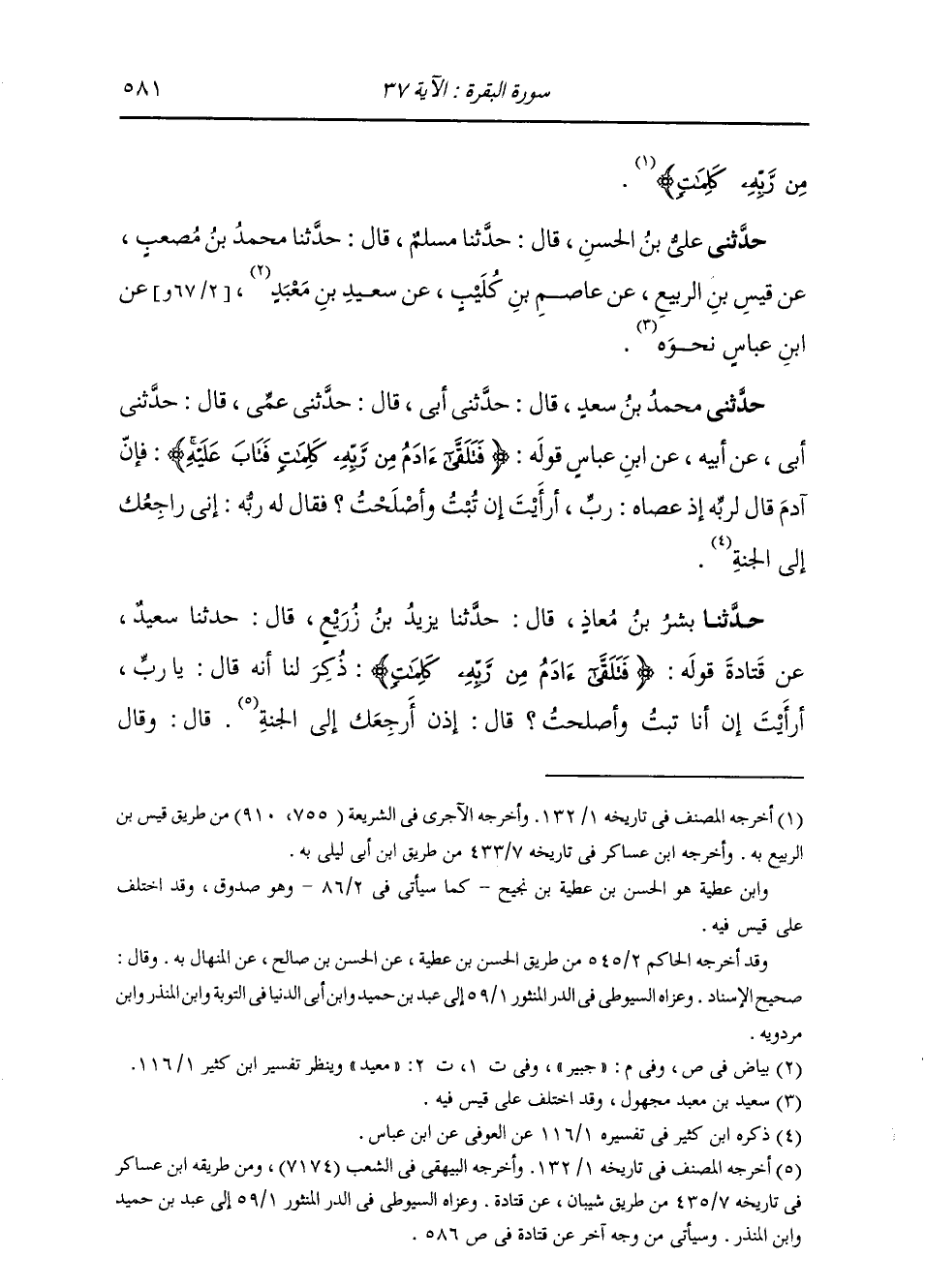 وَحَدَّثَنِي مُحَمَّدُ بْنُ سَعْدٍ، قَالَ: حَدَّثَنِي أَبِي، قَالَ: حَدَّثَنِي عَمِّي، قَالَ: حَدَّثَنِي أَبِي، عَنْ أَبِيهِ، عَنِ ابْنِ عَبَّاسٍ: " قَوْلُهُ: {§فَتَلَقَّى آدَمَ مِنْ رَبِّهِ كَلِمَاتٍ فَتَابَ عَلَيْهِ} [البقرة: 37] قَالَ: إِنَّ آدَمَ قَالَ لِرَبِّهِ إِذْ عَصَاهُ: رَبِّ أَرَأَيْتَ إِنْ أَنَا تُبْتُ وَأَصْلَحْتُ؟ فَقَالَ لَهُ رَبُّهُ: إِنِّي رَاجِعُكَ إِلَى الْجَنَّةِ "