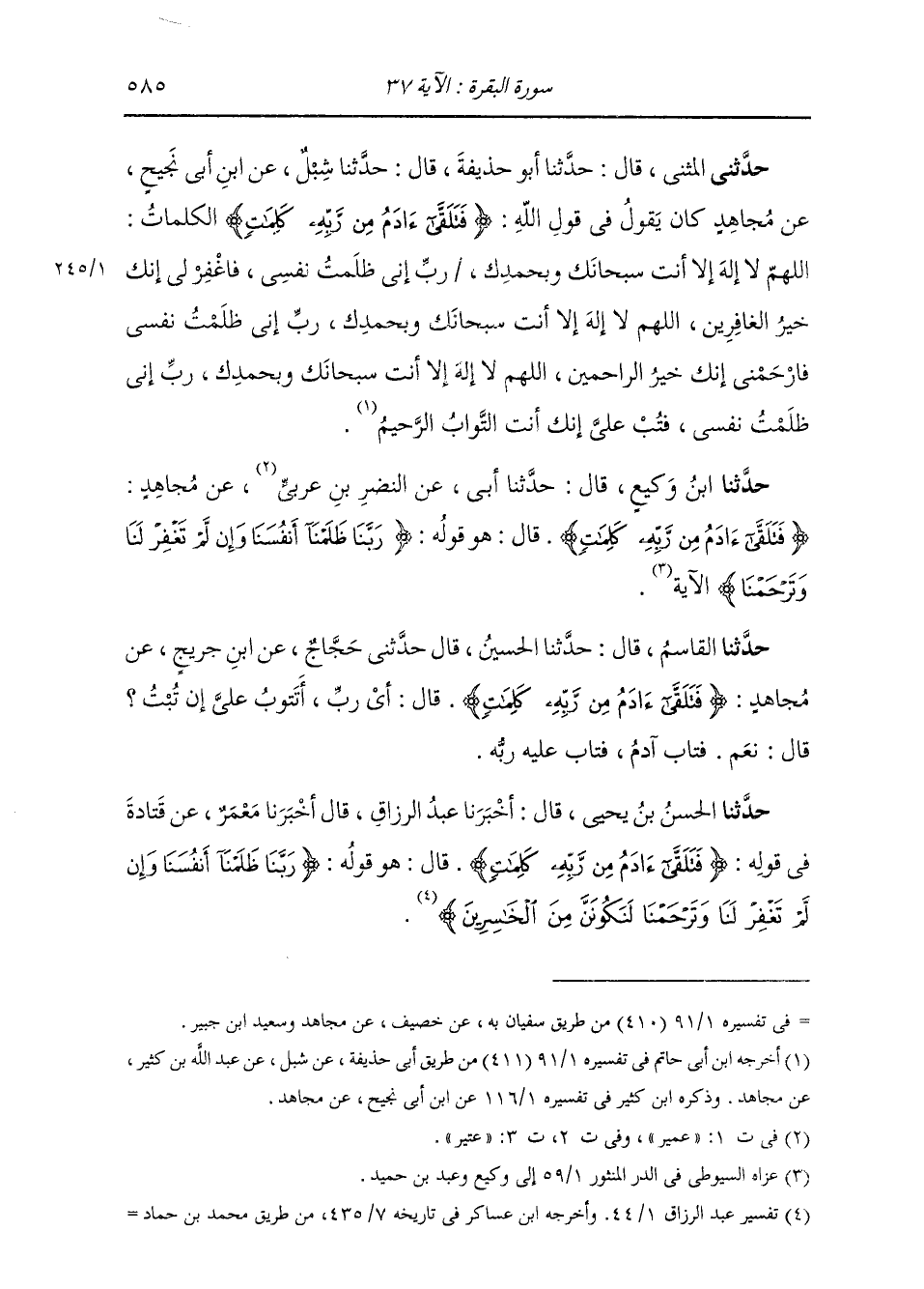 وَحَدَّثَنِي الْمُثَنَّى، قَالَ: حَدَّثَنَا أَبُو حُذَيْفَةَ، قَالَ: حَدَّثَنِي شِبْلٌ، عَنِ ابْنِ أَبِي نَجِيحٍ، عَنْ مُجَاهِدٍ: " كَانَ يَقُولُ فِي قَوْلِ اللَّهِ: {§فَتَلَقَّى آدَمُ مِنْ رَبِّهِ كَلِمَاتٍ} [البقرة: 37] الْكَلِمَاتُ: اللَّهُمَّ لَا إِلَهَ إِلَّا أَنْتَ سُبْحَانَكَ وَبِحَمْدِكَ، رَبِّ إِنِّي ظَلَمْتُ نَفْسِي فَاغْفِرْ لِي إِنَّكَ خَيْرُ الْغَافِرِينَ. اللَّهُمَّ لَا إِلَهَ إِلَّا أَنْتَ سُبْحَانَكَ وَبِحَمْدِكَ، رَبِّي إِنِّي ظَلَمْتُ نَفْسِي فَارْحَمْنِي إِنَّكَ خَيْرُ الرَّاحِمِينَ. اللَّهُمَّ لَا إِلَهَ إِلَّا أَنْتَ سُبْحَانَكَ وَبِحَمْدِكَ، رَبِّ إِنِّي ظَلَمْتُ نَفْسِي فَتُبْ عَلَيَّ إِنَّكَ أَنْتَ التَّوَّابُ الرَّحِيمُ "