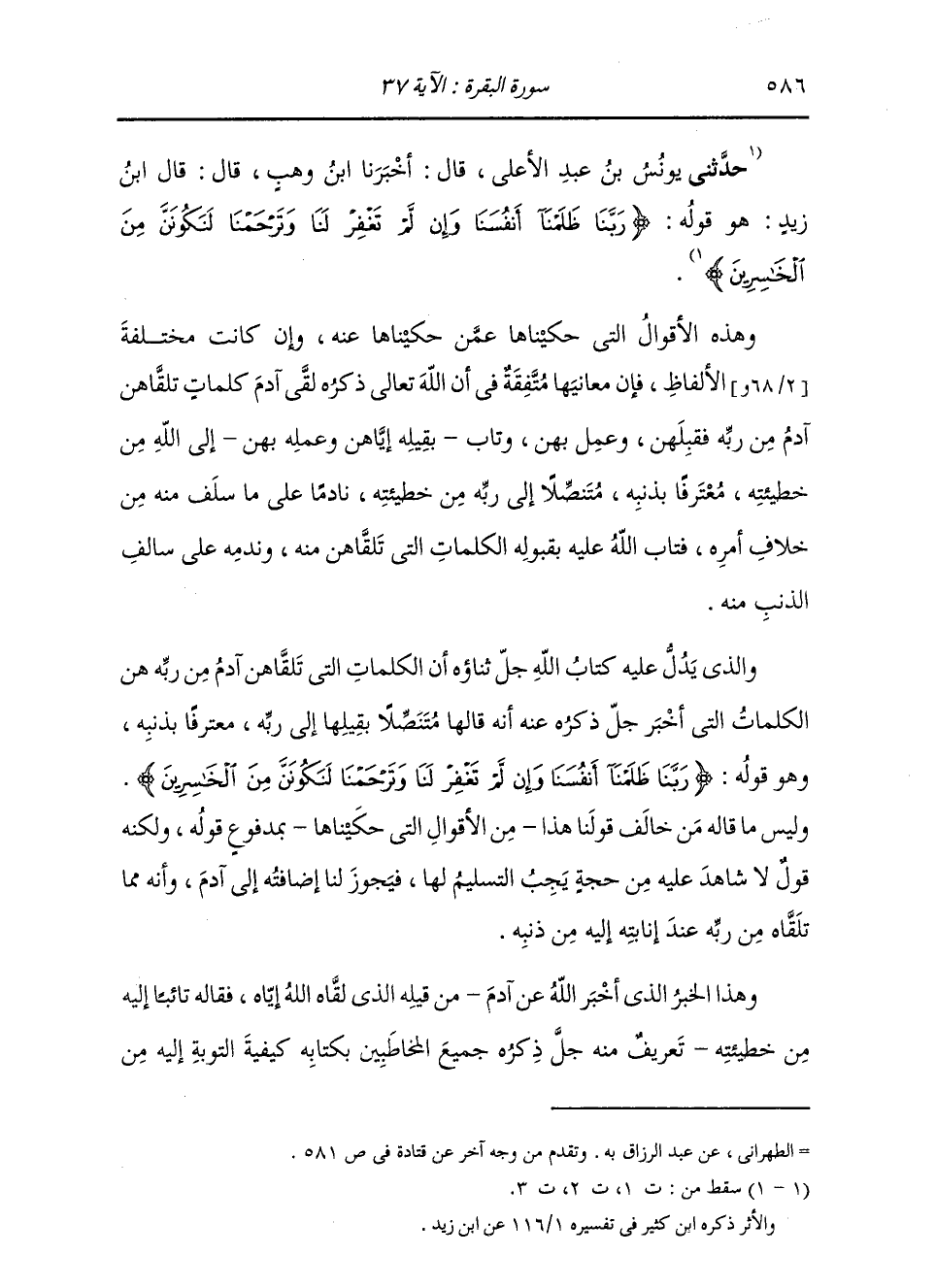 حَدَّثَنِي يُونُسُ، قَالَ: أَخْبَرَنَا ابْنُ وَهْبٍ، قَالَ: قَالَ ابْنُ زَيْدٍ: " هُوَ قَوْلُهُ: {§رَبَّنَا ظَلَمْنَا أَنْفُسَنَا وَإِنْ لَمْ تَغْفِرْ لَنَا وَتَرْحَمْنَا لَنَكُونَنَّ مِنَ الْخَاسِرِينَ} [الأعراف: 23] " وَهَذِهِ الْأَقْوَالُ الَّتِي حَكَيْنَاهَا عَمَّنْ حَكَيْنَاهَا عَنْهُ وَإِنْ كَانَتْ مُخْتَلِفَةَ الْأَلْفَاظِ، فَإِنَّ مَعَانِيهَا مُتَّفِقَةٌ فِي أَنَّ اللَّهَ جَلَّ ثَنَاؤُهُ لَقَّى آدَمَ كَلِمَاتٍ، فَتَلَقَّاهُنَّ آدَمُ مِنْ رَبِّهِ فَقَبِلَهُنَّ وَعَمِلَ بِهِنَّ وَتَابَ بِقِيلِهِ إِيَّاهُنَّ وَعَمَلِهِ بِهِنَّ إِلَى اللَّهِ مِنْ خَطِيئَتِهِ، مُعْتَرِفًا بِذَنَبِهِ مُتَنَصِّلًا إِلَى رَبِّهِ مِنْ خَطِيئَتِهِ، نَادِمََا عَلَى مَا سَلَفَ مِنْهُ مِنْ خِلَافِ أَمْرِهِ. فَتَابَ اللَّهُ عَلَيْهِ بِقَبُولِهِ الْكَلِمَاتِ الَّتِي تَلَقَّاهُنَّ مِنْهُ وَنَدَمِهِ عَلَى سَالِفِ الذَّنْبِ مِنْهُ. وَالَّذِي يَدُلُّ عَلَيْهِ كِتَابُ اللَّهِ أَنَّ الْكَلِمَاتِ الَّتِي تَلَقَّاهُنَّ آدَمُ مِنْ رَبِّهِ هُنَّ الْكَلِمَاتُ الَّتِي أَخْبَرَ اللَّهُ عَنْهُ أَنَّهُ قَالَهَا مُتَنَصِّلًا بِقِيلِهَا إِلَى رَبِّهِ مُعْتَرِفًا بِذَنَبِهِ وَهُوَ قَوْلُهُ: {رَبَّنَا ظَلَمْنَا أَنْفُسَنَا وَإِنْ لَمْ تَغْفِرْ لَنَا وَتَرْحَمْنَا لَنَكُونَنَّ مِنَ الْخَاسِرِينَ} [الأعراف: 23] وَلَيْسَ مَا قَالَهُ مَنْ خَالَفَ قَوْلَنَا هَذَا مِنَ الْأَقْوَالِ الَّتِي حَكَيْنَاهَا بِمَدْفُوعٍ قَوْلُهُ، وَلَكِنَّهُ قَوْلٌ لَا شَاهِدَ عَلَيْهِ مِنْ حُجَّةٍ يَجِبُ التَّسْلِيمُ لَهَا فَيَجُوزُ لَنَا إِضَافَتُهُ إِلَى آدَمَ، وَأَنَّهُ مِمَّا تَلَقَّاهُ مِنْ رَبِّهِ عِنْدَ إِنَابَتِهِ إِلَيْهِ مِنْ ذَنْبِهِ. وَهَذَا الْخَبَرُ الَّذِي أَخْبَرَ اللَّهُ عَنْ آدَمَ مِنْ قِيلِهِ الَّذِي لَقَّاهُ إِيَّاهُ فَقَالَهُ تَائِبًا إِلَيْهِ مِنْ خَطِيئَتِهِ، تَعْرِيفٌ مِنْهُ جَلَّ ذِكْرُهُ جَمِيعَ الْمُخَاطَبِينَ بِكِتَابِهِ كَيْفِيَّةَ التَّوْبَةِ إِلَيْهِ مِنَ -[587]- الذُّنُوبِ، وَتَنْبِيهٌ لِلْمُخَاطَبِينَ بِقَوْلِهِ: {كَيْفَ تَكْفُرُونَ بِاللَّهِ وَكُنْتُمْ أَمْوَاتًا فَأَحْيَاكُمْ} [البقرة: 28] عَلَى مَوْضِعِ التَّوْبَةِ مِمَّا هُمْ عَلَيْهِ مِنَ الْكُفْرِ بِاللَّهِ، وَأَنَّ خَلَاصَهُمْ مِمَّا هُمْ عَلَيْهِ مُقِيمُونَ مِنَ الضَّلَالَةِ نَظِيرُ خَلَاصِ أَبِيهِمْ آدَمَ مِنْ خَطِيئَتِهِ مَعَ تَذْكِيرِهِ إِيَّاهُمْ مِنَ السَّالِفِ إِلَيْهِمْ مِنَ النِّعَمِ الَّتِي خَصَّ بِهَا أَبَاهُمْ آدَمَ وَغَيْرَهُ مِنْ آبَائِهِمْ