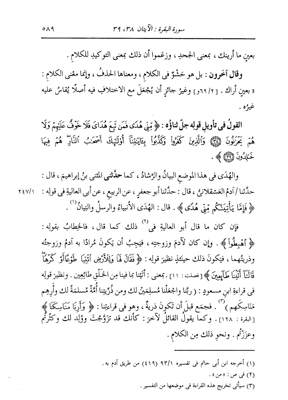 §الْقَوْلُ فِي تَأْوِيلِ قَوْلِهِ تَعَالَى: {مِنِّي هُدًى فَمَنْ تَبِعَ هُدَايَ فَلَا خَوْفٌ عَلَيْهِمْ وَلَا هُمْ يَحْزَنُونَ} [البقرة: 38] قَالَ أَبُو جَعْفَرٍ: وَالْهُدَى فِي هَذَا الْمَوْضِعِ الْبَيَانُ وَالرَّشَادُ