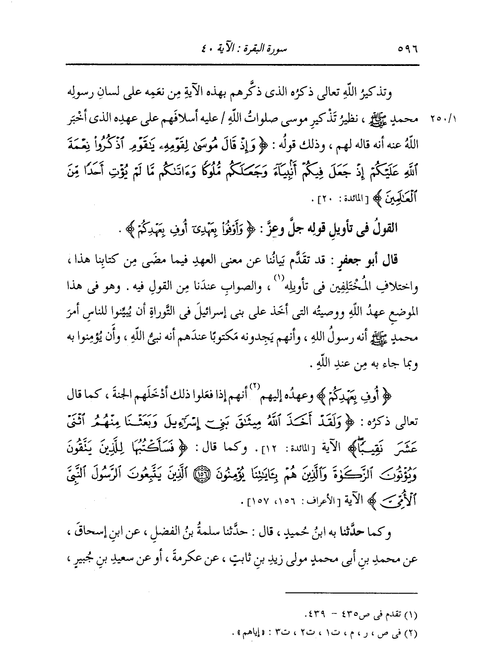 §الْقَوْلُ فِي تَأْوِيلِ قَوْلِهِ تَعَالَى: {وَأَوْفُوا بِعَهْدِي أُوفِ بِعَهْدِكُمْ} [البقرة: 40] قَالَ أَبُو جَعْفَرٍ: قَدْ تَقَدَّمَ بَيَانُنَا مَعْنَى الْعَهْدِ فِيمَا مَضَى مِنْ كِتَابِنَا هَذَا وَاخْتِلَافَ الْمُخْتَلِفِينَ فِي تَأْوِيلِهِ وَالصَّوَابَ عِنْدَنَا مِنَ الْقَوْلِ فِيهِ. وَهُوَ فِي هَذَا الْمَوْضِعِ عَهْدُ اللَّهِ وَوَصِيَّتُهُ الَّتِي أَخَذَ عَلَى بَنِي إِسْرَائِيلَ فِي التَّوْرَاةِ أَنْ يُبَيِّنُوا لِلنَّاسِ أَمْرَ مُحَمَّدٍ صَلَّى اللهُ عَلَيْهِ وَسَلَّمَ أَنَّهُ رَسُولٌ، وَأَنَّهُمْ يَجِدُونَهُ مَكْتُوبًا عِنْدَهُمْ فِي التَّوْرَاةِ أَنَّهُ نَبِيُّ اللَّهِ، وَأَنْ يُؤْمِنُوا بِهِ وَبِمَا جَاءَ بِهِ مِنْ عِنْدِ اللَّهِ {أُوفِ بِعَهْدِكُمْ} [البقرة: 40] وَعَهْدُهُ إِيَّاهُمْ: أَنَّهُمْ إِذَا فَعَلُوا ذَلِكَ أَدْخَلَهُمُ الْجَنَّةَ، كَمَا قَالَ جَلَّ ثَنَاؤُهُ: {وَلَقَدْ أَخَذَ اللَّهُ مِيثَاقَ بَنِي إِسْرَائِيلَ وَبَعَثَنَا مِنْهُمُ اثْنَيْ عَشَرَ نَقِيبًا} [المائدة: 12] الْآيَةُ، وَكَمَا قَالَ: {فَسَأَكْتُبُهَا لِلَّذِينَ يَتَّقُونَ وَيُؤْتُونَ الزَّكَاةَ وَالَّذِينَ هُمْ بِآيَاتِنَا يُؤْمِنُونَ الَّذِينَ يَتَّبِعُونَ الرَّسُولَ النَّبِيَّ الْأُمِّيَّ} [الأعراف: 157] الْآيَةُ