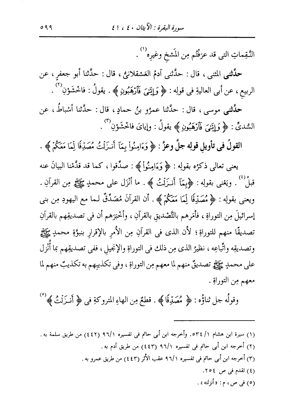 §وَيَعْنِي بِقَوْلِهِ: {مُصَدِّقًا لِمَا مَعَكُمْ} [البقرة: 41] أَنَّ الْقُرْآنَ مُصَدِّقٌ لِمَا مَعَ الْيَهُودِ مِنْ بَنِي إِسْرَائِيلَ مِنَ التَّوْرَاةِ. فَأَمَرَهُمْ بِالتَّصْدِيقِ بِالْقُرْآنِ، وَأَخْبَرَهُمْ جَلَّ ثَنَاؤُهُ أَنَّ فِيَ تَصْدِيقِهِمْ بِالْقُرْآنِ تَصْدِيقًا مِنْهُمْ لِلتَّوْرَاةِ؛ لِأَنَّ الَّذِي فِي الْقُرْآنِ مِنَ الْأَمْرِ بِالْإِقْرَارِ بِنُبُوَّةِ مُحَمَّدٍ صَلَّى اللهُ عَلَيْهِ وَسَلَّمَ وَتَصْدِيقِهِ وَاتِّبَاعِهِ نَظِيرُ الَّذِي مِنْ ذَلِكَ فِي الْإِنْجِيلِ وَالتَّوْرَاةِ. فَفِي تَصْدِيقِهِمْ بِمَا أَنْزَلَ عَلَى مُحَمَّدٍ تَصْدِيقٌ مِنْهُمْ لِمَا مَعَهُمْ مِنَ التَّوْرَاةِ، وَفِي تَكْذِيبِهِمْ بِهِ تَكْذِيبٌ مِنْهُمْ لِمَا مَعَهُمْ مِنَ التَّوْرَاةِ