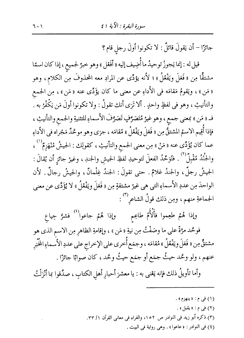 جَائِزًا أَنْ يَقُولَ قَائِلٌ: لَا تَكُونُوا أَوَّلَ رَجُلٍ قَامَ؟ قِيلَ لَهُ: إِنَّمَا يَجُوزُ تَوْحِيدُ مَا أُضِيفَ لَهُ أَفْعَلَ، وَهُوَ خَبَرٌ لِجَمْعٍ، إِذَا كَانَ مُشْتَقًّا مِنْ فَعَلَ وَيَفْعَلُ لِأَنَّهُ يُؤَدِّي عَنِ الْمُرَادِ مَعَهُ الْمَحْذُوفُ مِنَ الْكَلَامِ، وَهُوَ مِنْ، وَيَقُومُ مَقَامَهُ فِي الْأَدَاءِ عَنْ مَعْنَى مَا كَانَ يُؤَدِّي عَنْهُ مِنْ مِنَ الْجَمْعِ وَالتَّأْنِيثِ وَهُوَ فِي لَفْظٍ وَاحِدٍ. أَلَا تَرَى أَنَّكَ تَقُولُ: وَلَا تَكُونُوا أَوَّلَ مَنْ يَكْفُرُ بِهِ فَمِنْ بِمَعْنَى جَمْعٍ وَهُوَ غَيْرُ مُتَصَرِّفٍ تَصَرُّفَ الْأَسْمَاءِ لِلتَّثْنِيَةِ وَالْجَمْعِ وَالتَّأْنِيثِ. فَإِذَا أُقِيمَ الِاسْمُ الْمُشْتَقُّ مِنْ فَعَلَ وَيَفْعَلُ مَقَامَهُ، جَرَى وَهُوَ مُوَحَّدٌ مَجْرَاهُ فِي الْأَدَاءِ عَمَّا كَانَ يُؤَدِّي عَنْهُ مِنْ مَعْنَى الْجَمْعِ وَالتَّأْنِيثِ، كَقَوْلِكَ: الْجَيْشُ يَنْهَزِمُ، وَالْجُنْدُ يُقْبِلُ؛ فَتَوَحَّدَ الْفِعْلُ لِتَوْحِيدِ لَفْظِ الْجَيْشِ وَالْجُنْدِ، وَغَيْرُ جَائِزٍ أَنْ يُقَالَ: الْجَيْشُ رَجُلٌ، وَالْجُنْدُ غُلَامٌ، حَتَّى تَقُولَ: الْجُنْدُ غِلْمَانٌ، وَالْجَيْشُ رِجَالٌ؛ لِأَنَّ الْوَاحِدَ مِنْ عَدَدِ الْأَسْمَاءِ الَّتِي هِيَ غَيْرُ مُشْتَقَّةٍ مِنْ فَعَلَ وَيَفْعَلُ لَا يُؤَدِّي عَنْ مَعْنَى الْجَمَاعَةِ مِنْهُمْ، وَمِنْ ذَلِكَ قَوْلُ الشَّاعِرِ: