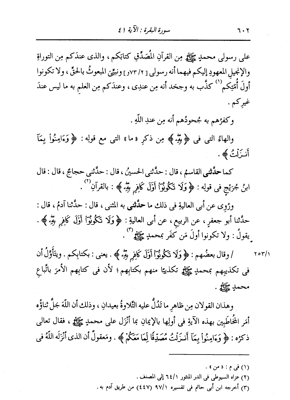عَلَى رَسُولِي مُحَمَّدٍ صَلَّى اللهُ عَلَيْهِ وَسَلَّمَ مِنَ الْقُرْآنِ الْمُصَدِّقِ كِتَابَكُمْ، وَالَّذِي عِنْدَكُمْ مِنَ التَّوْرَاةِ وَالْإِنْجِيلِ الْمَعْهُودِ إِلَيْكُمْ فِيهِمَا أَنَّهُ رَسُولِي وَنَبِيِّي الْمَبْعُوثُ بِالْحَقِّ، وَلَا تَكُونُوا أَوَّلَ مَنْ كَذَّبَ بِهِ وَجَحَدَ أَنَّهُ مِنْ عِنْدِي وَعِنْدَكُمْ مِنَ الْعِلْمِ بِهِ مَا لَيْسَ عِنْدَ غَيْرِكُمْ. وَكُفْرُهُمْ بِهِ: جُحُودُهُمْ أَنَّهُ مِنْ عِنْدِ اللَّهِ، وَالْهَاءُ الَّتِي فِي بِهِ مِنْ ذِكْرِ مَا الَّتِي مَعَ قَوْلِهِ: {وَآمِنُوا بِمَا أَنْزَلْتُ} [البقرة: 41]