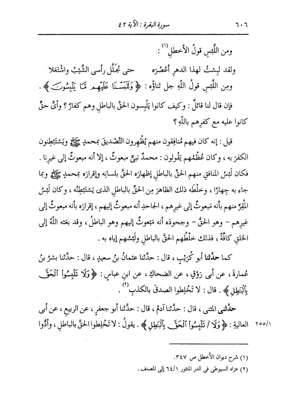 كَمَا حَدَّثَنَا بِهِ أَبُو كُرَيْبٍ، قَالَ: حَدَّثَنَا عُثْمَانُ بْنُ سَعِيدٍ، قَالَ: حَدَّثَنَا بِشْرُ بْنُ عُمَارَةَ، عَنْ أَبِي رَوْقٍ، عَنِ الضَّحَّاكِ، عَنِ ابْنِ عَبَّاسٍ: " قَوْلُهُ: {§وَلَا تَلْبِسُوا الْحَقَّ بِالْبَاطِلِ} [البقرة: 42] قَالَ: لَا تَخْلِطُوا الصِّدْقَ بِالْكَذِبِ "