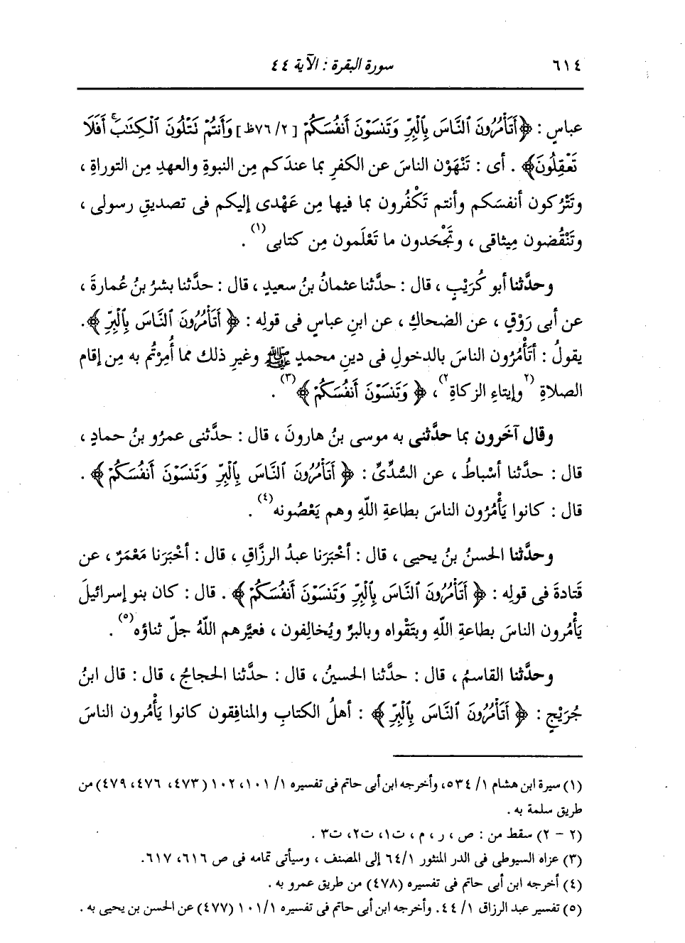 وَحَدَّثَنَا أَبُو كُرَيْبٍ، قَالَ: حَدَّثَنَا عُثْمَانُ بْنُ سَعِيدٍ، قَالَ: حَدَّثَنَا بِشْرُ بْنُ عُمَارَةَ، عَنْ أَبِي رَوْقٍ، عَنِ الضَّحَّاكِ، عَنِ ابْنِ عَبَّاسٍ: " فِي قَوْلِهِ: {أَتَأْمُرُونَ النَّاسَ بِالْبِرِّ} [البقرة: 44] يَقُولُ: §أَتَأْمُرُونَ النَّاسَ بِالدُّخُولِ فِي دِينِ مُحَمَّدٍ صَلَّى اللهُ عَلَيْهِ وَسَلَّمَ، وَغَيْرِ ذَلِكَ مِمَّا أُمِرْتُمْ بِهِ مِنْ إِقَامِ الصَّلَاةِ {وَتَنْسَوْنَ أَنْفُسَكُمْ} [البقرة: 44] "