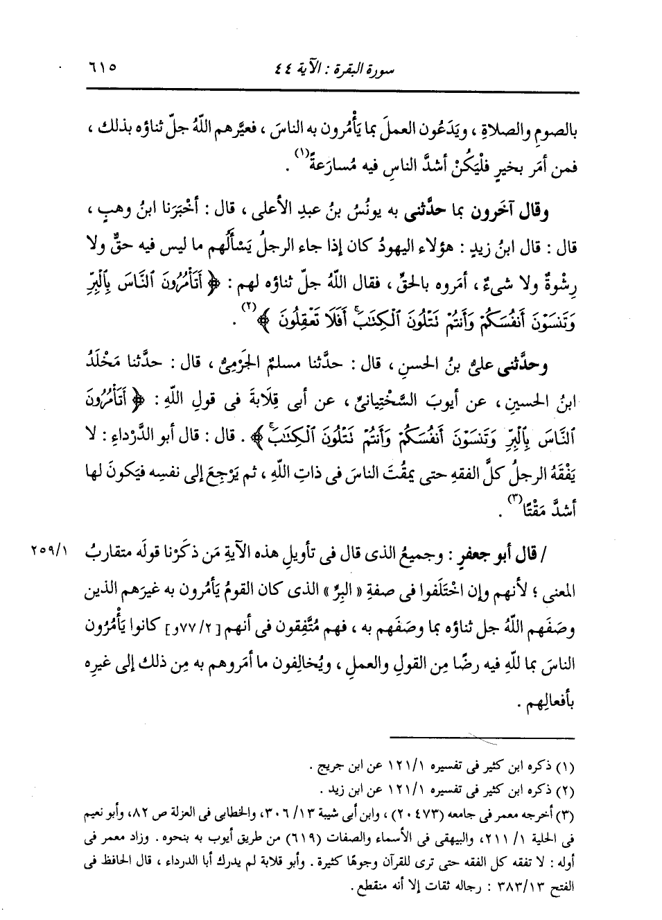 وَحَدَّثَنِي عَلِيُّ بْنُ الْحَسَنِ، قَالَ: حَدَّثَنَا مُسْلِمٌ الْحَرَمِيُّ، قَالَ: حَدَّثَنَا مَخْلَدُ بْنُ الْحُسَيْنِ، عَنْ أَيُّوبَ السَّخْتِيَانِيِّ، عَنْ أَبِي قِلَابَةَ: " فِي قَوْلِ اللَّهِ: {أَتَأْمُرُونَ النَّاسَ بِالْبِرِّ وَتَنْسَوْنَ أَنْفُسَكُمْ وَأَنْتُمْ تَتْلُونَ الْكِتَابَ} [البقرة: 44] قَالَ: قَالَ أَبُو الدَّرْدَاءِ: §لَا يَفْقَهُ الرَّجُلُ كُلَّ الْفِقْهِ حَتَّى يَمْقُتَ النَّاسَ فِي ذَاتِ اللَّهِ ثُمَّ يَرْجِعَ إِلَى نَفْسِهِ فَيَكُونَ لَهَا أَشَدَّ مَقْتًا " قَالَ أَبُو جَعْفَرٍ: وَجَمِيعُ الَّذِي قَالَ فِي تَأْوِيلِ هَذِهِ الْآيَةِ مِنْ ذِكْرِنَا قَوْلَهُ مُتَقَارِبُ الْمَعْنَى؛ لِأَنَّهُمْ وَإِنِ اخْتَلَفُوا فِي صِفَةِ الْبِرِّ الَّذِي كَانَ الْقَوْمُ يَأْمُرُونَ بِهِ غَيْرَهُمُ الَّذِينَ وَصَفَهُمُ اللَّهُ بِمَا وَصَفَهُمْ بِهِ فَهُمْ مُتَّفِقُونَ فِي أَنَّهُمْ كَانُوا يَأْمُرُونَ النَّاسَ بِمَا لِلَّهِ فِيهِ رِضًا مِنَ الْقَوْلِ أَوِ الْعَمَلِ، وَيُخَالِفُونَ مَا أَمَرُوهُمْ بِهِ مِنْ ذَلِكَ إِلَى غَيْرِهِ بِأَفْعَالِهِمْ -[616]- فَالتَّأْوِيلُ الَّذِي يَدُلُّ عَلَى صِحَّتِهِ ظَاهِرُ التِّلَاوَةِ إِذًا: أَتَأْمُرُونَ النَّاسَ بِطَاعَةِ اللَّهِ وَتَتْرُكُونَ أَنْفُسَكُمْ تَعْصِيهِ، فَهَلَّا تَأْمُرُونَهَا بِمَا تَأْمُرُونَ بِهِ النَّاسَ مِنْ طَاعَةِ رَبِّكُمْ. مُعَيِّرُهُمْ بِذَلِكَ وَمُقَبِّحًا إِلَيْهِمْ مَا أَتَوْا بِهِ. وَمَعْنَى نِسْيَانِهِمْ أَنْفُسَهُمْ فِي هَذَا الْمَوْضِعِ نَظِيرُ النِّسْيَانِ الَّذِي قَالَ جَلَّ ثَنَاؤُهُ: {نَسُوا اللَّهَ فَنَسِيَهُمْ} [التوبة: 67] بِمَعْنَى: تَرَكُوا طَاعَةَ اللَّهِ فَتَرَكَهُمُ اللَّهُ مِنْ ثَوَابِهِ