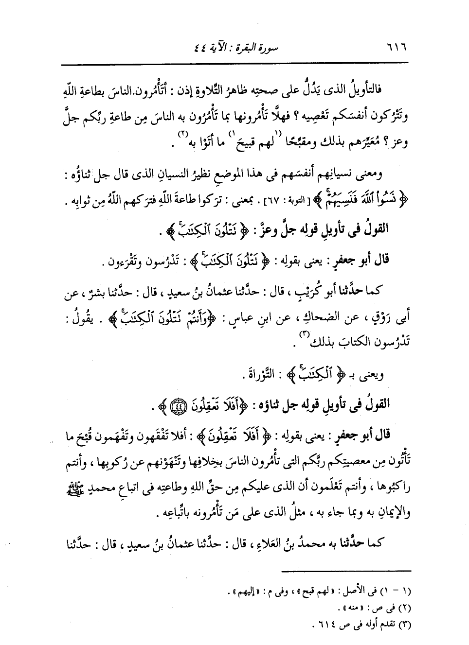 §الْقَوْلُ فِي تَأْوِيلِ قَوْلِهِ تَعَالَى: {وَأَنْتُمْ تَتْلُونَ الْكِتَابَ} [البقرة: 44] قَالَ أَبُو جَعْفَرٍ: يَعْنِي بِقَوْلِهِ: {تَتْلُونَ} [البقرة: 44] تَدْرُسُونَ وَتَقْرَءُونَ