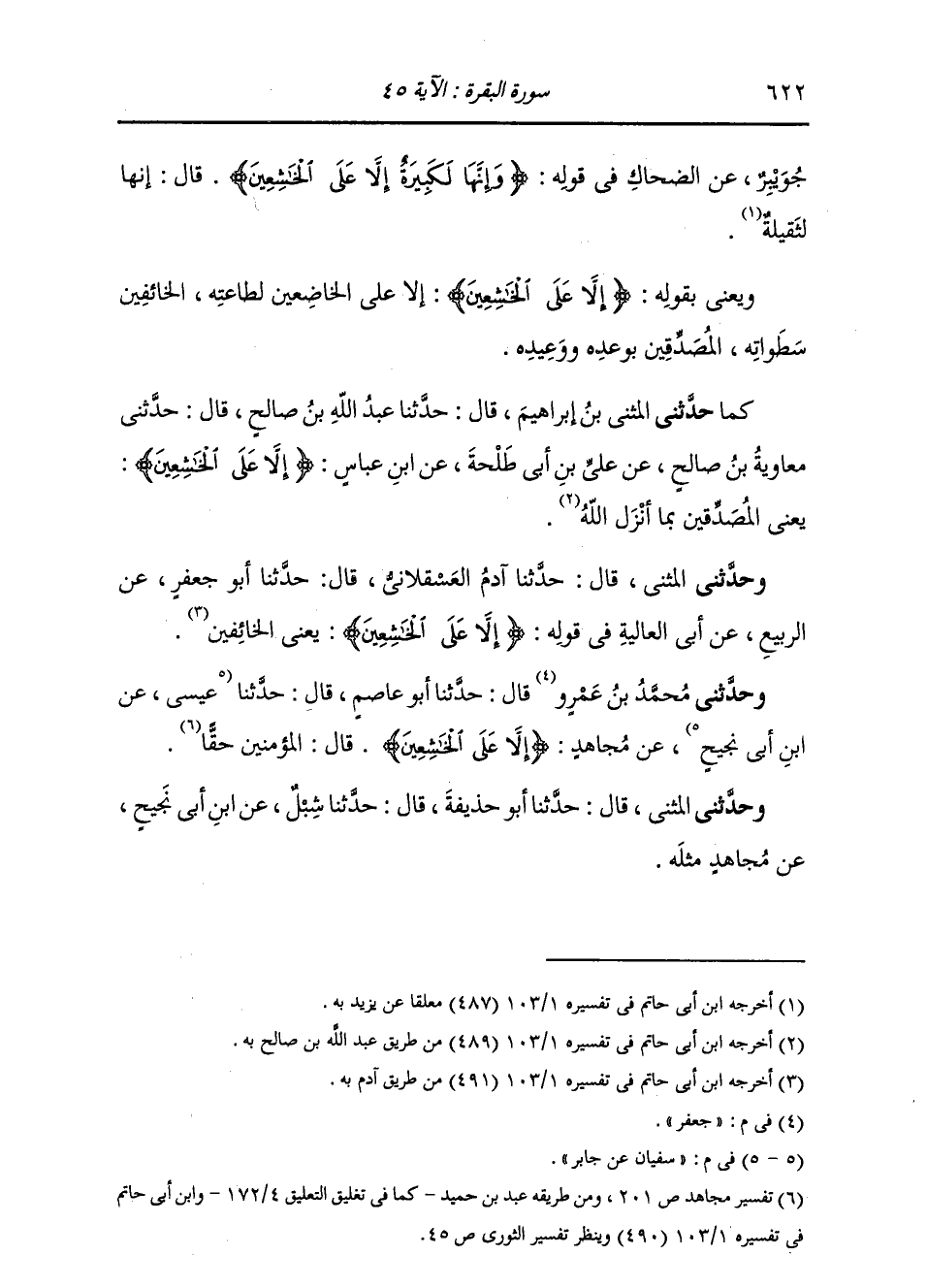 كَمَا حَدَّثَنِي الْمُثَنَّى بْنُ إِبْرَاهِيمَ، قَالَ: حَدَّثَنَا عَبْدُ اللَّهِ بْنُ صَالِحٍ، قَالَ: حَدَّثَنِي مُعَاوِيَةُ بْنُ صَالِحٍ، عَنْ عَلِيِّ بْنِ أَبِي طَلْحَةَ، عَنِ ابْنِ عَبَّاسٍ: " {§إِلَّا عَلَى الْخَاشِعِينَ} [البقرة: 45] يَعْنِي الْمُصَدِّقِينَ بِمَا أَنْزَلَ اللَّهُ "