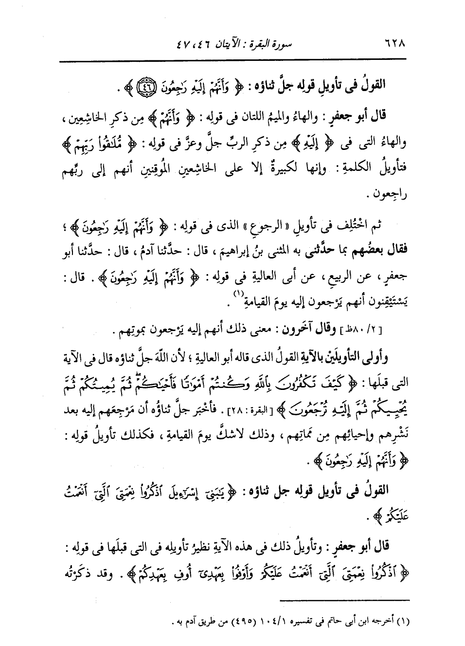 §الْقَوْلُ فِي تَأْوِيلِ قَوْلِهِ تَعَالَى: {وَأَنَّهُمْ إِلَيْهِ رَاجِعُونَ} [البقرة: 46] قَالَ أَبُو جَعْفَرٍ: وَالْهَاءُ وَالْمِيمُ اللَّتَانِ فِي قَوْلِهِ: {وَأَنَّهُمْ} [البقرة: 46] مِنْ ذِكْرِ الْخَاشِعِينِ، وَالْهَاءُ فِي إِلَيْهِ مِنْ ذِكْرِ الرَّبِّ تَعَالَى ذِكْرُهُ فِي قَوْلِهِ: {مُلَاقُو رَبِّهِمْ} [البقرة: 46] فَتَأْوِيلُ الْكَلِمَةِ: وَإِنَّهَا لَكَبِيرَةٌ إِلَّا عَلَى الْخَاشِعِينَ الْمُوقِنِينَ أَنَّهُمْ إِلَى رَبِّهِمْ رَاجِعُونَ. ثُمَّ اخْتُلِفَ فِي تَأْوِيلِ الرُّجُوعِ الَّذِي فِي قَوْلِهِ: {وَأَنَّهُمْ إِلَيْهِ رَاجِعُونَ} [البقرة: 46]
