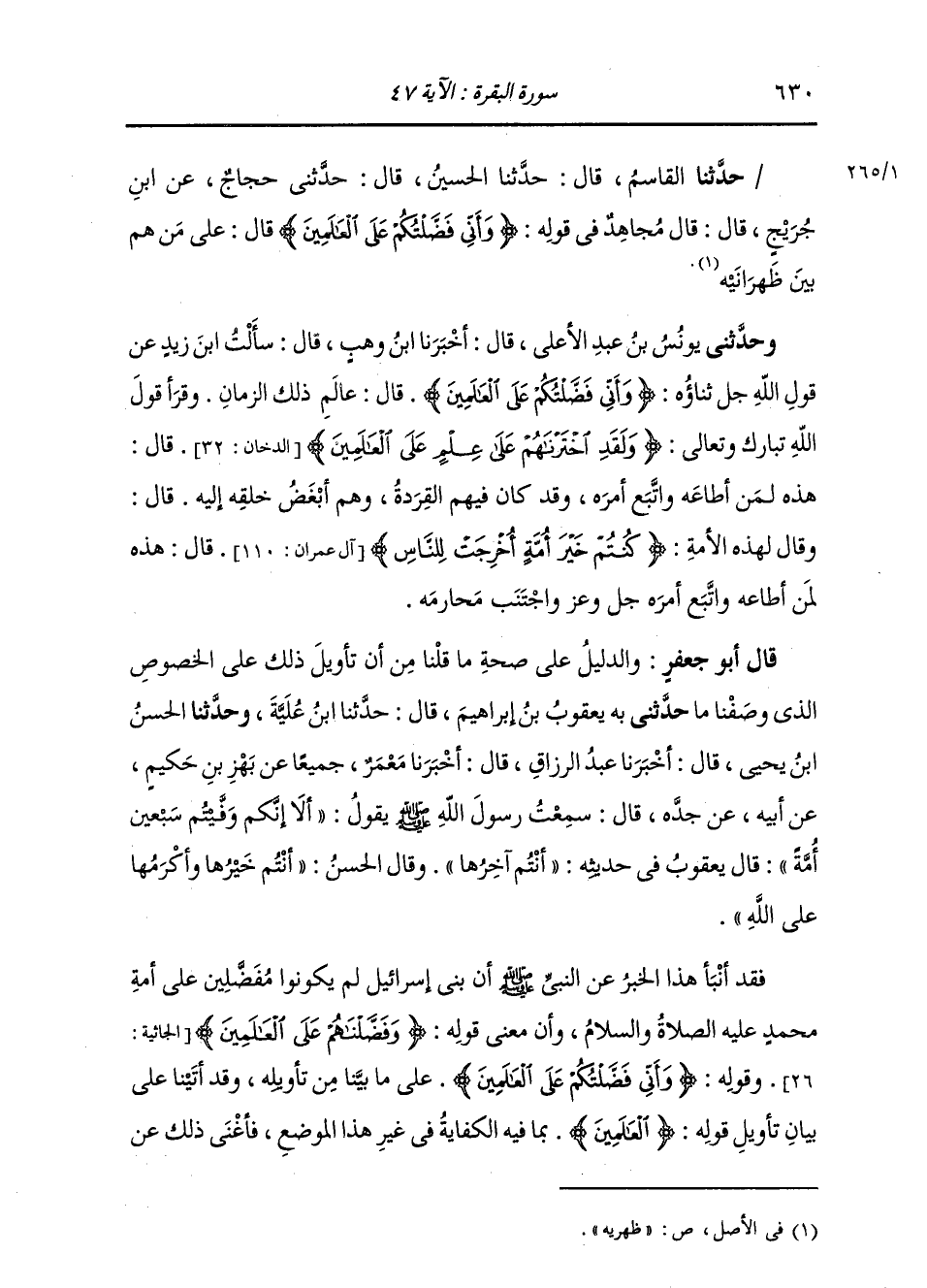 وَحَدَّثَنِي يُونُسُ بْنُ عَبْدِ الْأَعْلَى، قَالَ: أَخْبَرَنَا ابْنُ وَهْبٍ، قَالَ: سَأَلْتُ ابْنَ زَيْدٍ عَنْ قَوْلِ اللَّهِ: " {وَأَنِّي فَضَّلْتُكُمْ عَلَى الْعَالَمِينَ} [البقرة: 47] قَالَ: §عَالَمِ أَهْلِ ذَلِكَ الزَّمَانِ. وَقَرَأَ قَوْلَ اللَّهِ: {وَلَقَدِ اخْتَرْنَاهُمْ عَلَى عِلْمٍ عَلَى الْعَالَمِينَ} [الدخان: 32] قَالَ: هَذِهِ لِمَنْ أَطَاعَهُ وَاتَّبَعَ أَمْرَهُ، وَقَدْ كَانَ فِيهِمُ الْقِرَدَةُ وَهُمْ أَبْغَضُ خَلْقِهِ إِلَيْهِ، وَقَالَ لِهَذِهِ الْأُمَّةِ: {كُنْتُمْ خَيْرَ أُمَّةٍ أُخْرِجَتْ لِلنَّاسِ} [آل عمران: 110] قَالَ: هَذِهِ لِمَنْ أَطَاعَ اللَّهَ وَاتَّبَعَ أَمْرَهُ وَاجْتَنَبَ مَحَارِمَهُ " قَالَ أَبُو جَعْفَرٍ: وَالدَّلِيلُ عَلَى صِحَّةِ مَا قُلْنَا مِنْ أَنَّ تَأْوِيلَ ذَلِكَ عَلَى الْخُصُوصِ الَّذِي وَصَفْنَا