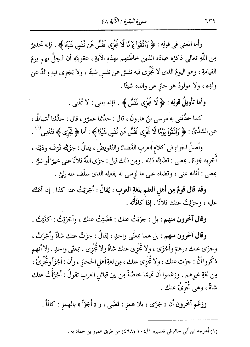 كَمَا حَدَّثَنِي بِهِ، مُوسَى بْنُ هَارُونَ، قَالَ: حَدَّثَنَا عَمْرٌو، قَالَ: حَدَّثَنَا أَسْبَاطٌ، عَنِ السُّدِّيِّ: " {§وَاتَّقُوا يَوْمًا لَا تَجْزِي نَفْسٌ} [البقرة: 48] أَمَّا تَجْزِي: فَتُغْنِي " وَأَصْلُ الْجَزَاءِ فِي كَلَامِ الْعَرَبِ: الْقَضَاءُ وَالتَّعْوِيضُ يُقَالُ: جَزَيْتُهُ قَرْضَهُ وَدَيْنَهُ أَجْزِيهِ جَزَاءً، بِمَعْنَى: قَضَيْتُهُ دَيْنَهُ، وَمِنْ ذَلِكَ قِيلَ: جَزَى اللَّهُ فُلَانًا عَنِّي خَيْرًا أَوْ شَرًّا، بِمَعْنَى: أَثَابَهُ عَنِّي وَقَضَاهُ عَنِّي مَا لَزِمَنِي لَهُ بِفِعْلِهِ الَّذِي سَلَفَ مِنْهُ إِلَيَّ. وَقَدْ قَالَ قَوْمٌ مِنْ أَهْلِ الْعِلْمِ بِلُغَةِ الْعَرَبِ: يُقَالُ: أَجْزَيْتُ عَنْهُ كَذَا: إِذَا أَعَنْتُهُ عَلَيْهِ، وَجَزَيْتُ عَنْكَ فُلَانًا: إِذَا كَافَأْتُهُ. وَقَالَ آخَرُونَ مِنْهُمْ: بَلْ جَزَيْتُ عَنْكَ: قَضَيْتُ عَنْكَ، وَأَجْزَيْتُ: كَفَيْتُ. وَقَالَ آخَرُونَ مِنْهُمْ: بَلْ هُمَا بِمَعْنَى وَاحِدٍ، يُقَالُ: جَزَتْ عَنْكَ شَاةٌ وَأَجْزَتْ، وَجَزَى عَنْكَ دِرْهَمٌ وَأَجْزَى، وَلَا تَجْزِي عَنْكَ شَاةٌ وَلَا تَجْزِي بِمَعْنَى وَاحِدٍ، إِلَّا أَنَّهُمْ ذَكَرُوا أَنَّ جَزَتْ عَنْكَ وَلَا تَجْزِي عَنْكَ مِنْ لُغَةِ أَهْلِ الْحِجَازِ، وَأَنَّ أَجْزَأَ وَتُجْزِئُ مِنْ لُغَةِ غَيْرِهِمْ. وَزَعَمُوا أَنَّ تَمِيمًا خَاصَّةً مِنْ بَيْنِ قَبَائِلِ الْعَرَبِ تَقُولُ: أَجْزَأَتْ عَنْكَ شَاةٌ، وَهِيَ تُجْزِئُ عَنْكَ. وَزَعَمَ آخَرُونَ أَنَّ جُزِيَ بِلَا هَمْزٍ: قَضَى، وَأَجْزَأَ بِالْهَمْزِ: كَافَأَ.