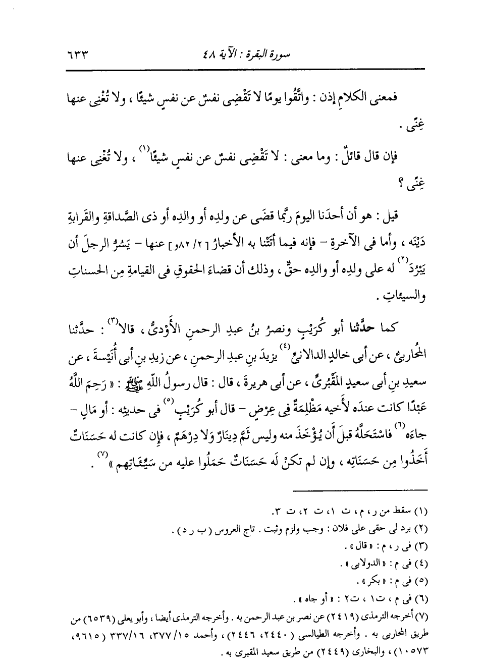 فَمَعْنَى الْكَلَامِ إِذًا: وَاتَّقُوا يَوْمًا لَا تَقْضِي نَفْسٌ عَنْ نَفْسٍ شَيْئًا وَلَا تُغْنِي عَنْهَا غِنًى. فَإِنْ قَالَ لَنَا قَائِلٌ: وَمَا مَعْنَى: لَا تَقْضِي نَفْسٌ عَنْ نَفْسٍ، وَلَا تُغْنِي عَنْهَا غِنًى؟ قِيلَ: هُوَ أَنَّ أَحَدَنَا الْيَوْمَ رُبَّمَا قَضَى عَنْ وَلَدِهِ أَوْ وَالِدِهِ أَوْ ذِي الصَّدَاقَةِ وَالْقَرَابَةِ دَيْنَهُ؛ وَأَمَّا فِي الْآخِرَةِ فَإِنَّهُ فِيمَا أَتَتْنَا بِهِ الْأَخْبَارُ عَنْهَا يَسُرُّ الرَّجُلَ أَنْ يَبْرُدَ لَهُ عَلَى وَلَدِهِ أَوْ وَالِدِهِ حَقٌّ، وَذَلِكَ أَنَّ قَضَاءَ الْحُقُوقِ فِي الْقِيَامَةِ مِنَ الْحَسَنَاتِ وَالسَّيِّئَاتِ