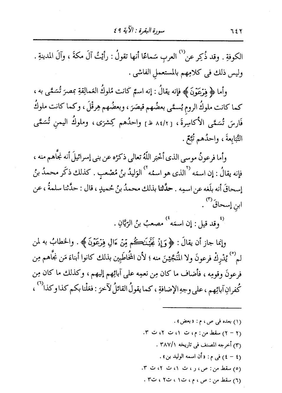 الْكُوفَةِ. وَقَدْ ذُكِرَ عَنْ بَعْضِ الْعَرَبِ سَمَاعًا أَنَّهَا تَقُولُ: رَأَيْتُ آلَ مَكَّةَ وَآلَ الْمَدِينَةِ، وَلَيْسَ ذَلِكَ فِي كَلَامِهِمْ بِالْمُسْتَعْمَلِ الْفَاشِي. وَأَمَّا فِرْعَوْنُ فَإِنَّهُ يُقَالُ: إِنَّهُ اسْمٌ كَانَتْ مُلُوكُ الْعَمَالِقَةِ بِمِصْرَ تُسَمَّى بِهِ كَمَا كَانَتْ مُلُوكُ الرُّومِ يُسَمِّي بَعْضُهُمْ قَيْصَرٌ وَبَعْضُهُمْ هِرَقْلٌ، وَكَمَا كَانَتْ مُلُوكُ فَارِسَ تُسَمَّى الْأَكَاسِرَةَ وَاحِدُهُمْ كِسْرَى وَمُلُوكُ الْيَمَنِ تُسَمَّى التَّبَابِعَةَ وَاحِدُهُمْ تُبَّعٌ. وَأَمَّا فِرْعَوْنُ مُوسَى الَّذِي أَخْبَرَ اللَّهُ تَعَالَى عَنْ بَنِي إِسْرَائِيلَ أَنَّهُ نَجَّاهُمْ مِنْهُ فَإِنَّهُ يُقَالُ: إِنَّ اسْمَهُ الْوَلِيدُ بْنُ مُصْعَبِ بْنِ الرَّيَّانِ، وَكَذَلِكَ ذَكَرَ مُحَمَّدُ بْنُ إِسْحَاقَ أَنَّهُ بَلَغَهُ عَنِ اسْمِهِ