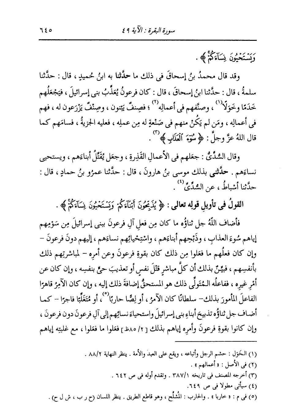 §الْقَوْلُ فِي تَأْوِيلِ قَوْلِهِ تَعَالَى: {يُذَبِّحُونَ أَبْنَاءَكُمْ وَيَسْتَحْيُونَ نِسَاءَكُمْ} [البقرة: 49] قَالَ أَبُو جَعْفَرٍ: وَأَضَافَ اللَّهُ جَلَّ ثَنَاؤُهُ مَا كَانَ مِنْ فِعْلِ آلِ فِرْعَوْنَ بِبَنِي إِسْرَائِيلَ، مِنْ سَوْمِهِمْ إِيَّاهُمْ سُوءَ الْعَذَابِ وَذَبْحِهِمْ أَبْنَاءَهُمْ وَاسْتِحْيَائِهِمْ نِسَاءَهُمْ، إِلَيْهِمْ دُونَ فِرْعَوْنَ، وَإِنْ كَانَ فِعْلُهُمْ مَا فَعَلُوا مِنْ ذَلِكَ كَانَ بِقُوَّةِ فِرْعَوْنَ وَعَنْ أَمْرِهِ، لِمُبَاشَرَتِهِمْ ذَلِكَ بِأَنْفُسِهِمْ. فَبَيَّنَ بِذَلِكَ أَنَّ كُلَّ مُبَاشِرٍ قَتْلَ نَفْسٍ أَوْ تَعْذِيبَ حَيٍّ بِنَفْسِهِ وَإِنْ كَانَ عَنْ أَمْرِ غَيْرِهِ، فَفَاعِلُهُ الْمُتَوَلِّي ذَلِكَ هُوَ الْمُسْتَحِقُّ إِضَافَةَ ذَلِكَ إِلَيْهِ، وَإِنْ كَانَ الْآمِرُ قَاهِرًا الْفَاعِلَ الْمَأْمُورَ بِذَلِكَ سُلْطَانًا كَانَ الْآمِرُ أَوْ لِصًّا خَارِبًا أَوْ مُتَغَلِّبًا فَاجِرًا، كَمَا أَضَافَ جَلَّ ثَنَاؤُهُ ذَبْحَ أَبْنَاءِ بَنِي إِسْرَائِيلَ وَاسْتِحْيَاءَ نِسَائِهِمْ إِلَى آلِ فِرْعَوْنَ دُونَ فِرْعَوْنَ، وَإِنْ كَانُوا بِقُوَّةِ فِرْعَوْنَ وَأَمْرِهِ إِيَّاهُمْ بِذَلِكَ فَعَلُوا مَا فَعَلُوا مَعَ غَلَبَتِهِ إِيَّاهُمْ